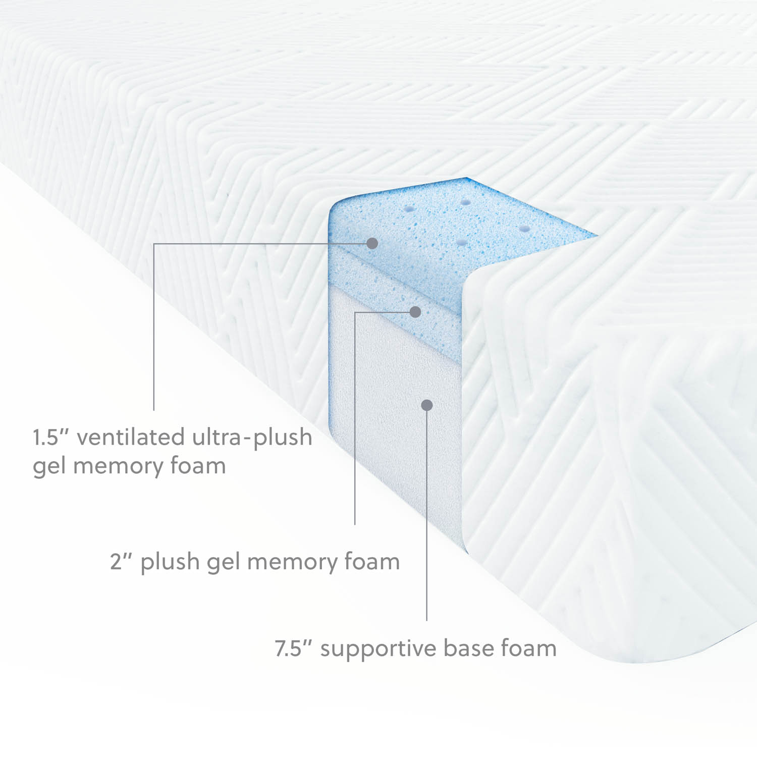 A 1.5-inch, ultra-plush layer of ventilated, gel-infused air foam; a 2-inch layer of temperature-regulating gel-infused memory foam; and 7.5 inches of high-density base foam create the perfect combination of body-conforming softness and plenty of support. Mattress had a perfectly medium feel that is not too firm and not too plush.