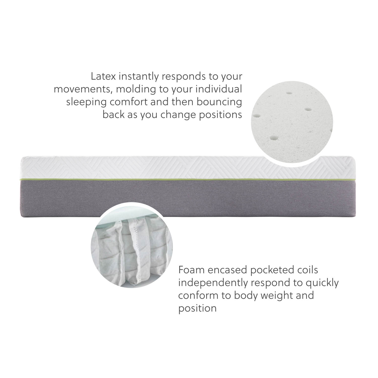The responsive comfort of natural latex and the traditional support of an innerspring mattress come together in this 14-inch latex hybrid mattress. At the surface, a thick layer of ventilated latex offers resilient response. Beneath the latex, gel memory foam and plush memory foam comfort layers conform to curves for superior pressure relief for restful sleep. These comfort layers are designed to improve temperature and breathability for a more comfortable sleep climate. At its base, a unit of 12-gauge pocket coils provides the traditional support and bounce of a top-quality spring mattress.