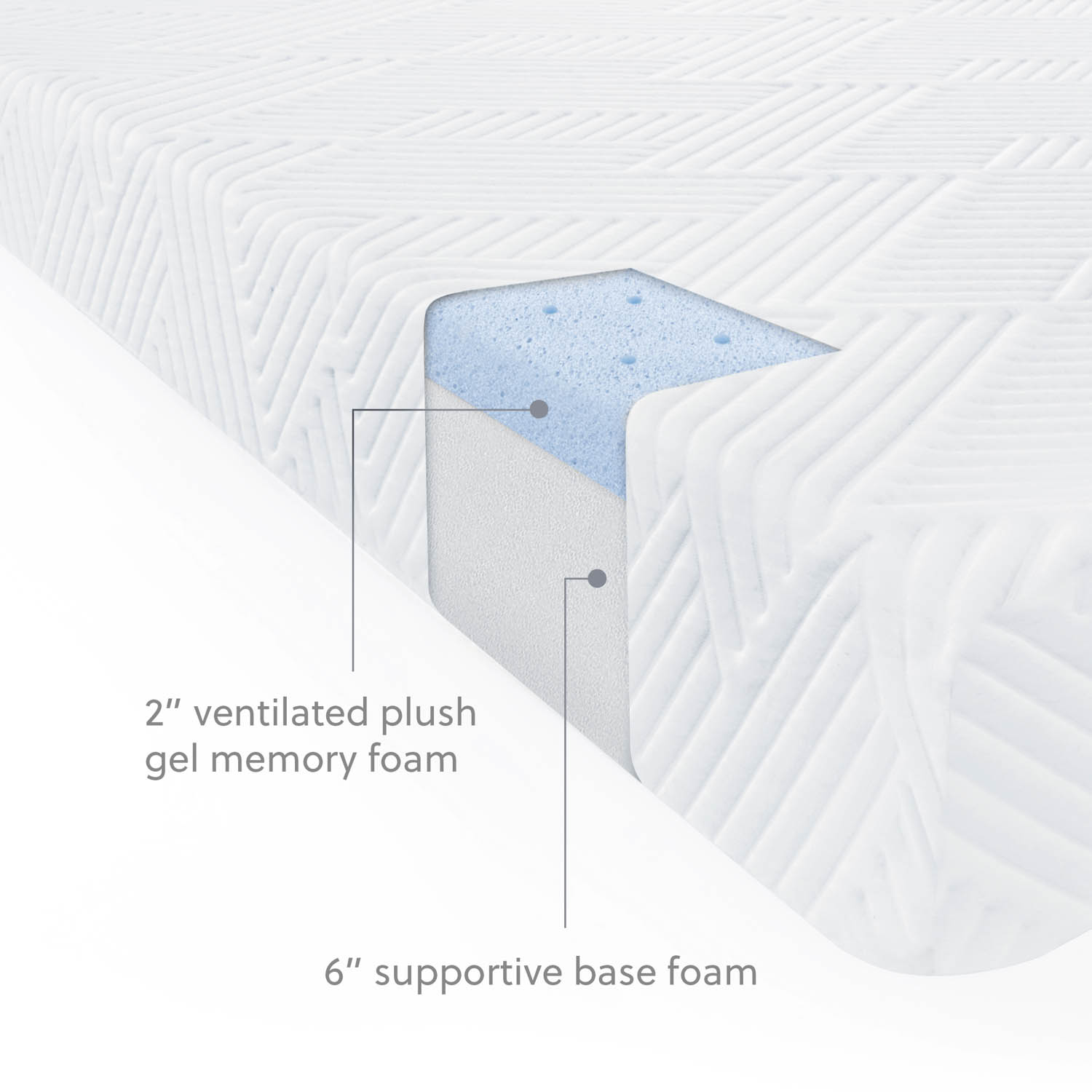 Two-inch layer of ventilated, gel-infused memory foam eases pressure points and regulates temperature. A 6-inch layer of high density base foam offers superior support and a firm feel. An ultra-soft quilted cover creates an air layer for luxurious comfort.