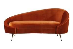 Take a seat on this beautiful retro cloud. An asymmetrical back, velvety softness, and gold stainless steel legs make the Abigail chaise. Perfect for the 60s-obsessed or anyone with impeccable taste.