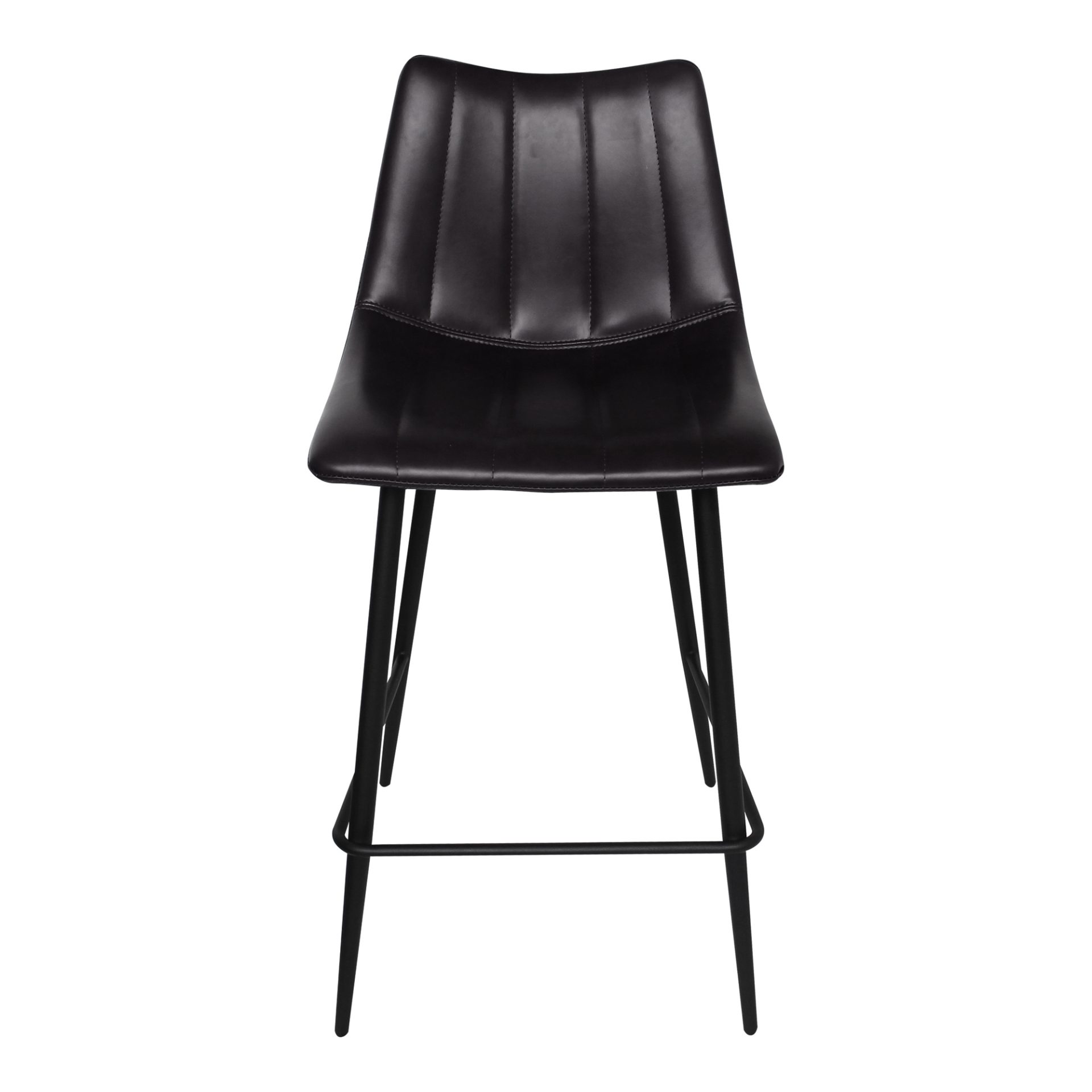 The Alibi counter stool emanates elegance and functionality. This sophisticated seating option boasts a sleek silhouette, accentuated by the subtle yet striking vertical line stitching adorning its monochromatic design. The plush faux leather seat is expertly contoured, providing an inviting and comfortable experience, at once both laid-back and refined.