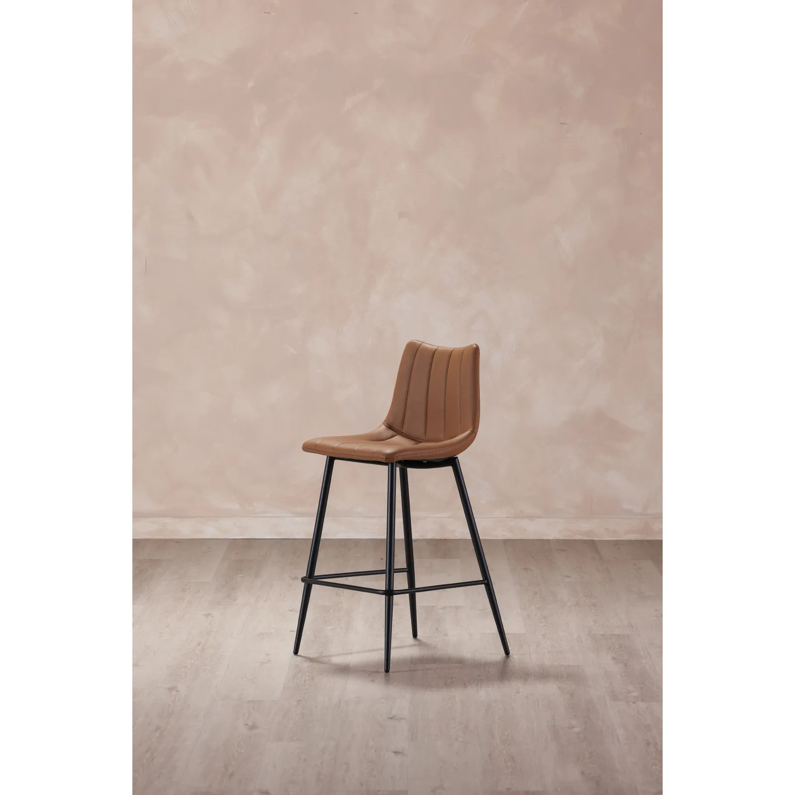 Contemporary modern counter stools get a new take with this sleek aesthetic. Available in several colors, the Alibi counter stool features striking vertical line stitches that add subtle detail to its monochromatic design. A soft vegan leather seat is shaped to fit for comfort so guests can relax at the island or bar counter.