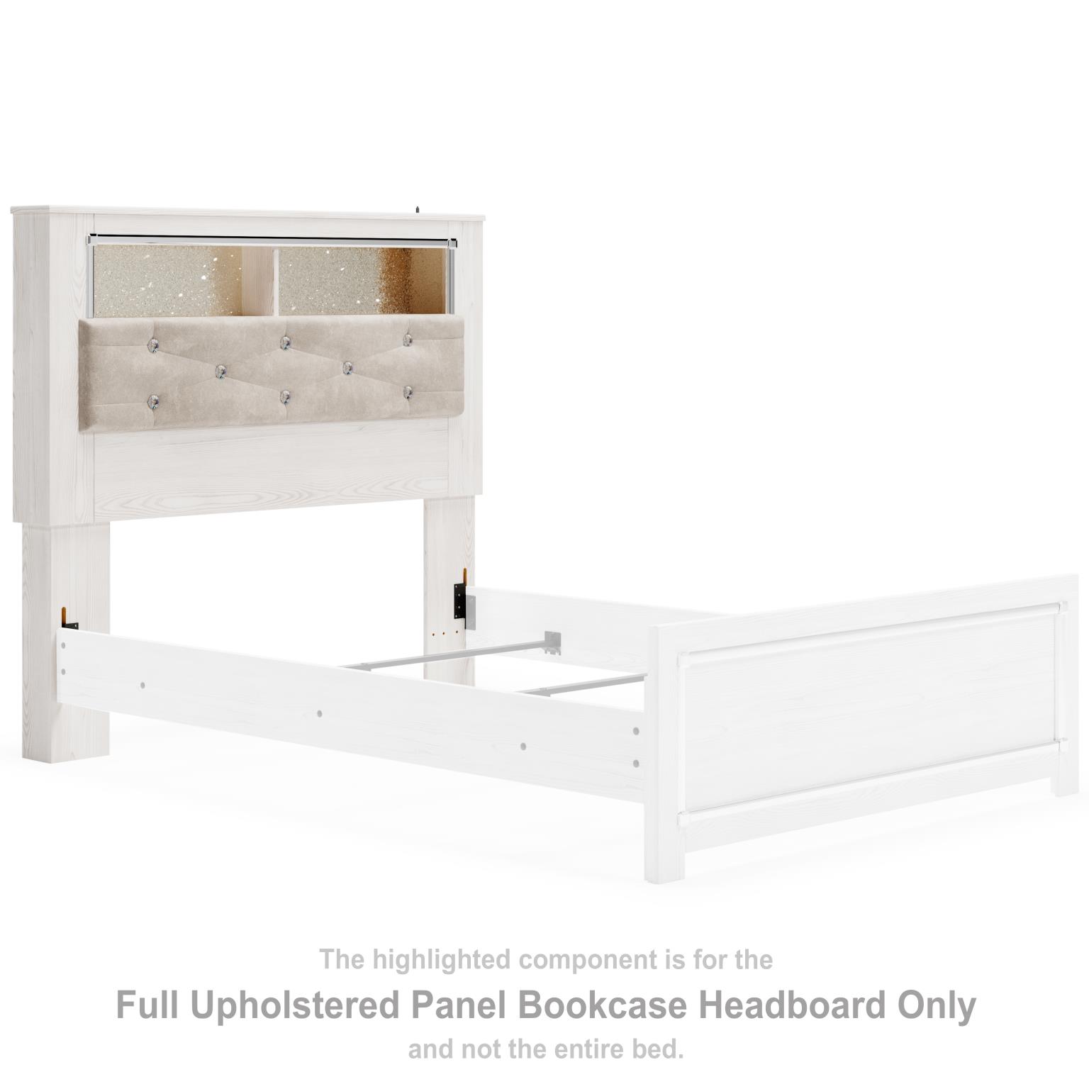 The epitome of fashion-forward design,,,, this full upholstered bookcase headboard is a beautiful blend of comfort and luxury. Shiny chrome-tone accents,,,, a pearlized finish and button-tufted upholstery bring a glam touch to the richly rustic appearance. Remote-controlled LED lighting adds style and modern convenience to your restful retreat.