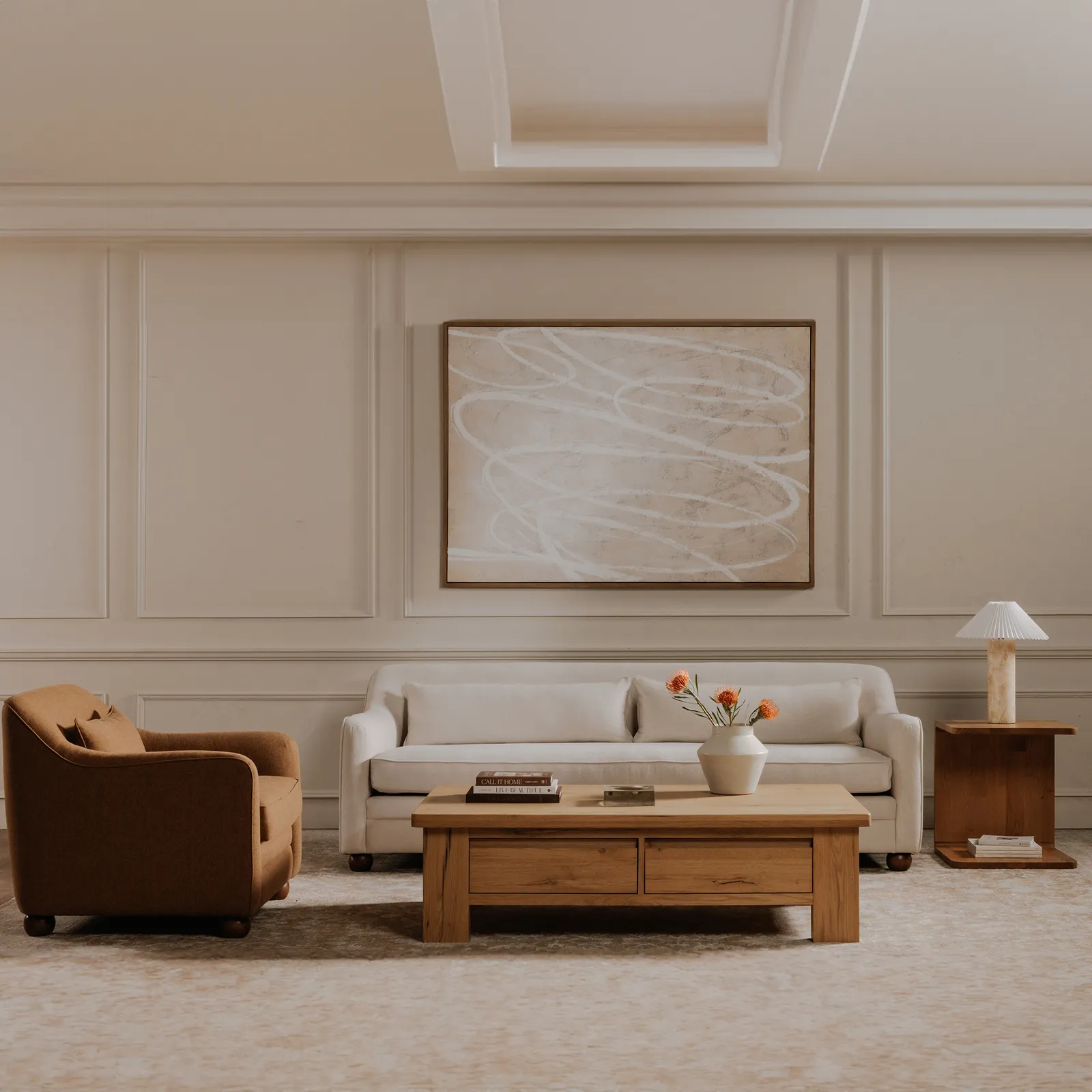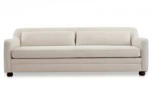The Amira sofa offers warmth and comfort with its gracefully curved high back and subtly flared arms. Upholstered in durable polyester fabric with piping cushion details. The feather and fiber topped bench seat cushion creates luxurious repose. Generously proportioned lumbar cushions and solid wood feet complete this centerpiece.