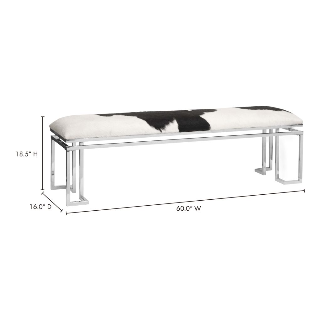 This modern bench combines unfinished cowhide on a slick stainless steel frame for a fashionable, designer look. Ideal entry way, bedroom, or dining room for a uniquely personal touch to your décor. Note that each bench uses genuine hides and variations are to be expected.