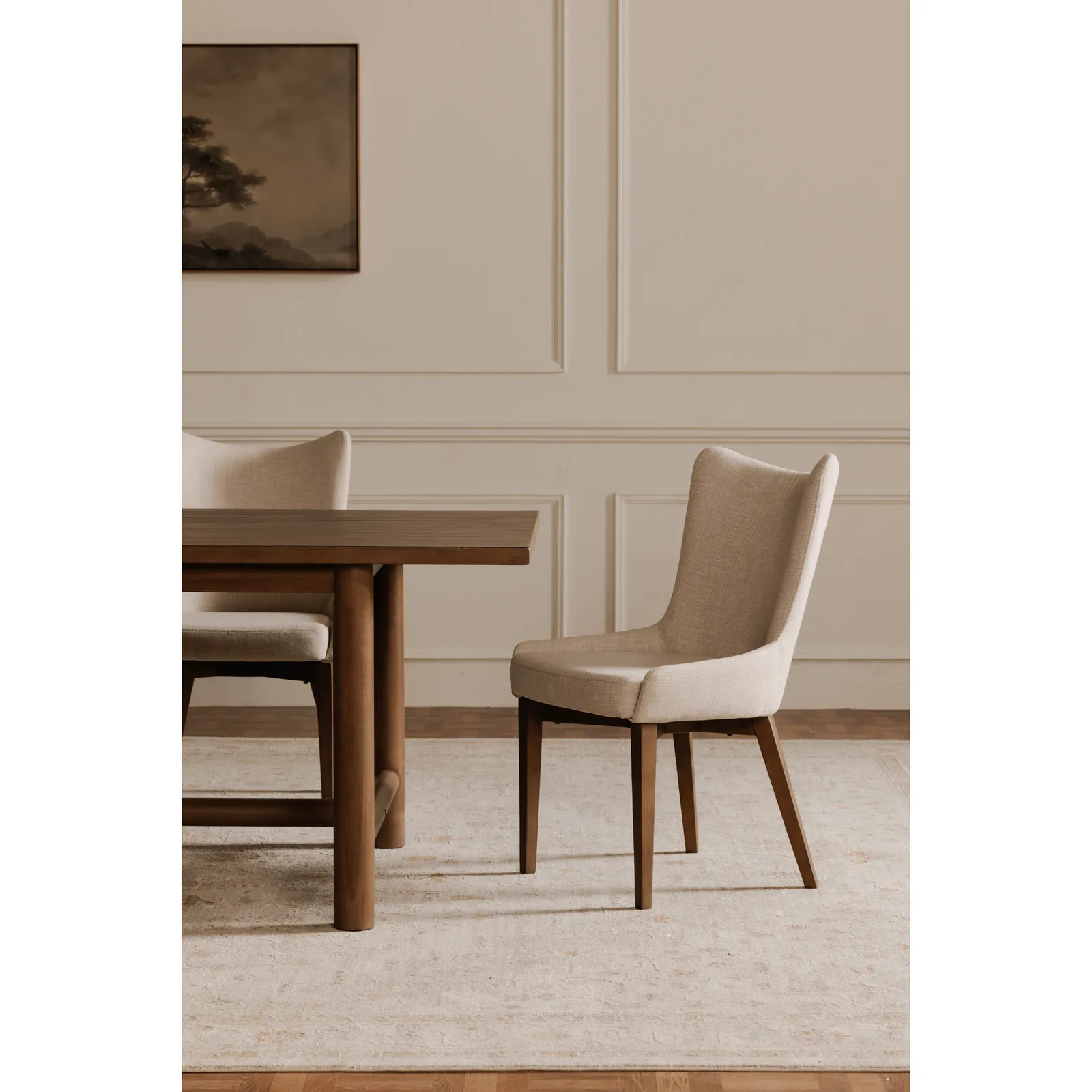 The Arden dining table’s straight-edge tabletop exudes modern elegance while retaining a timeless charm. Its four cylindrical legs offer a softened silhouette juxtaposed with the table’s clean lines and visual lightness. Stretcher bars infuse a touch of rustic appeal with its pine construction’s rich, dark brown finish.