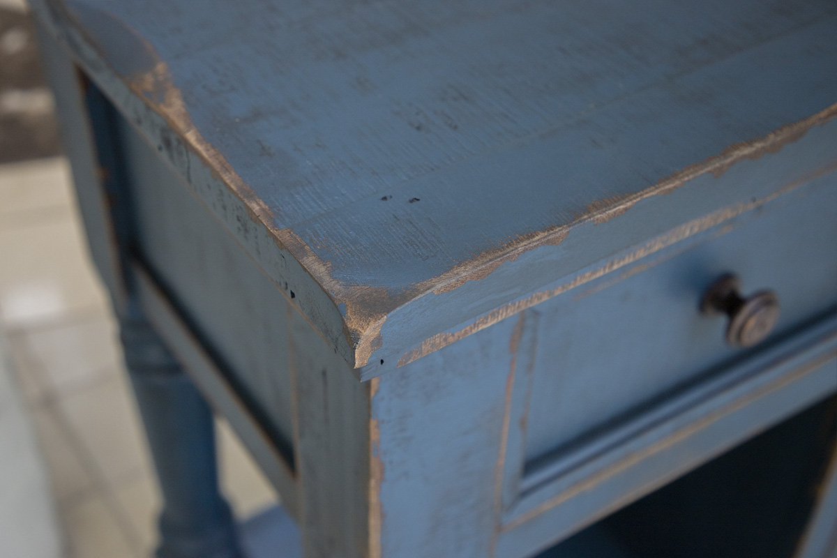 • A white antiqued finish is applied using a hand-rubbed technique in a multi-step process.