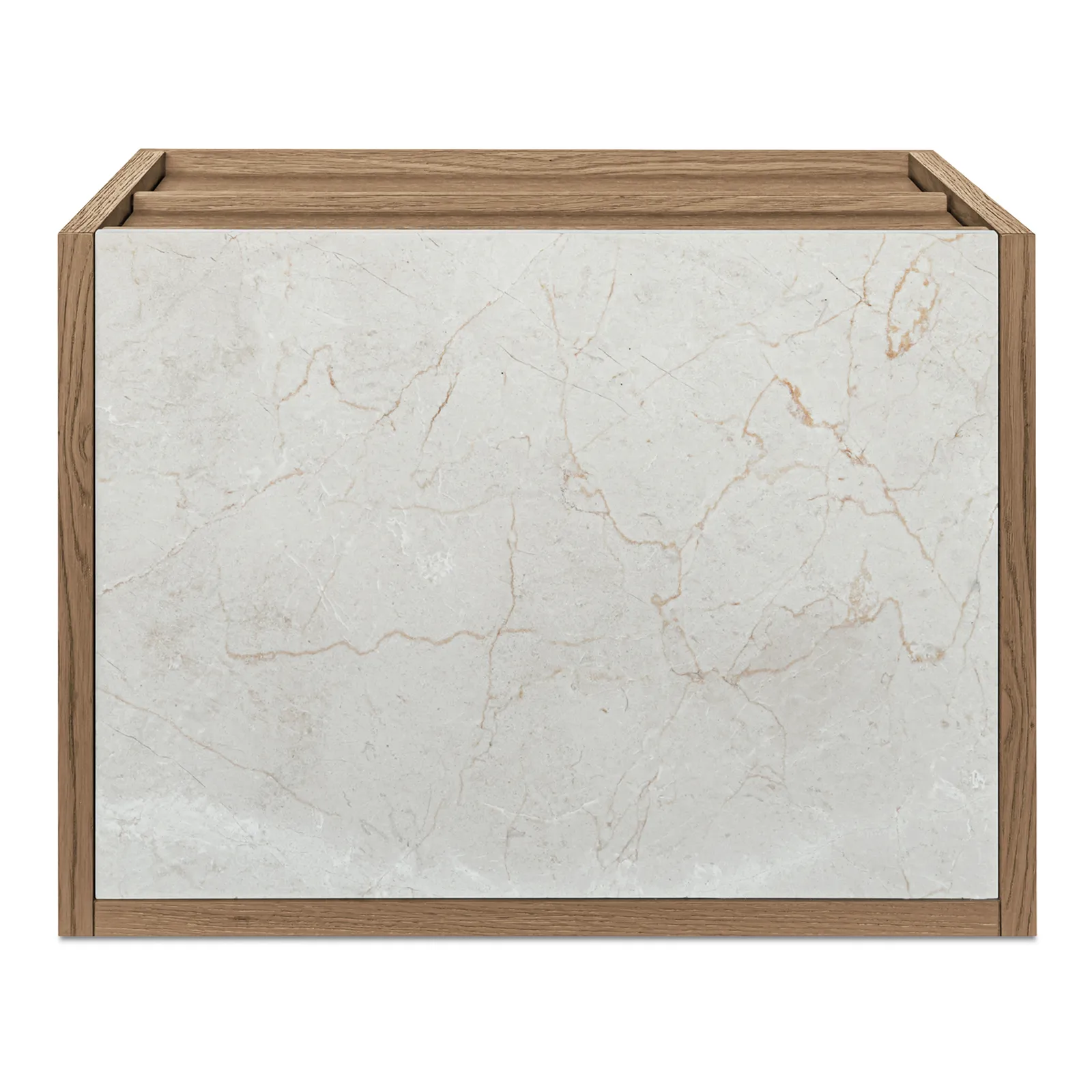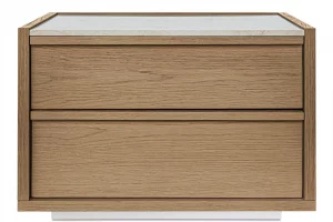 The perfect bedroom companion. A light rosa marble tabletop lies firmly over solid oak frame and oak veneer drawers. Its two soft-close compartments provide ample space for bedside needs.