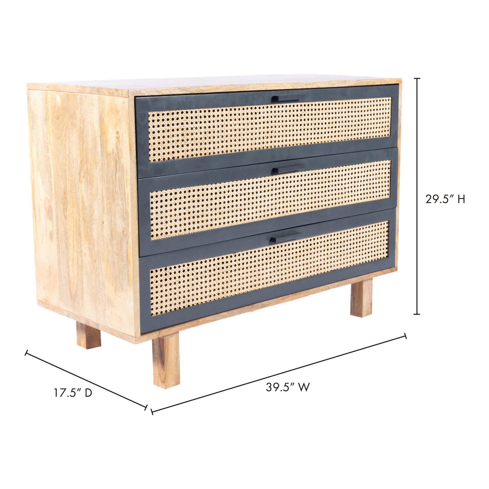 A stylish combination of solid mango wood and woven cane gives the Ashton Chest a fresh contemporary style. Three spacious, dark-framed drawers maximizes storage options for smaller bedrooms. The metal drawer glides allow for easy access and durability.