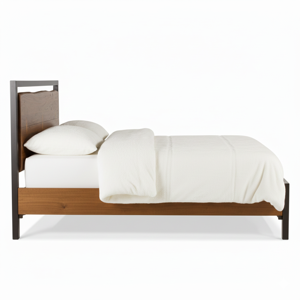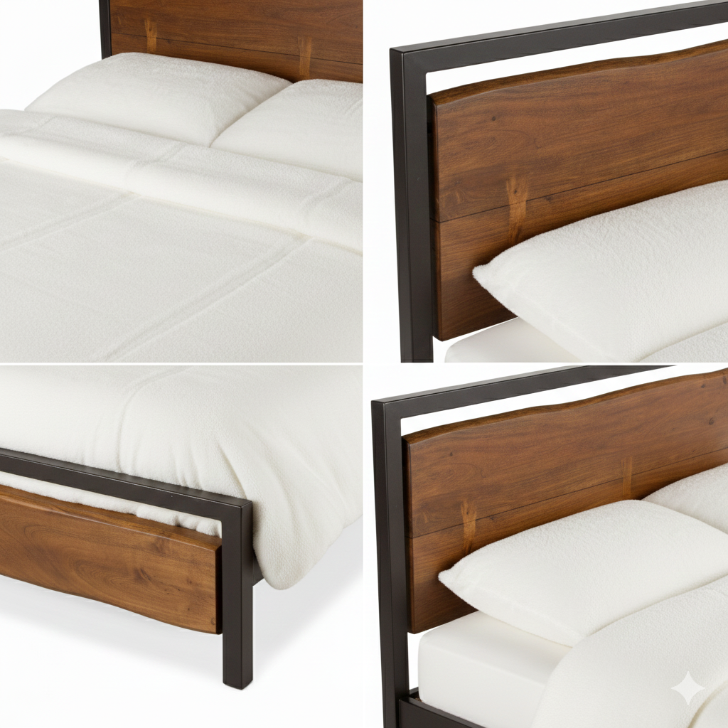 The faux live-edge and deep walnut finish of the furniture in our Aspen Collection is a warm contrast to the sleek perfection of their steel bases. Crafted from solid acacia wood and reclaimed iron, each piece features heirloom-quality techniques to ensure durability for years to come. Combining Organic Forgec silhouettes with modern details for a casual and transitional style, this hand-crafted faux live edge king bed frame is made with acacia wood featuring uneven edges and butterfly joinery detailing on the headboard and footboard. The catalyzed water-based walnut finish on the wood creates an amazing luminosity that evokes beauty from every angle while also being durable for daily use. The headboard and footboard are each framed by square, U-shaped recycled iron tubing in antique zinc finish, creating a fusion of modern and contemporary elements. This king bed frame requires assembly and is made with materials of the finest quality, making it the perfect place for resting your head at night.