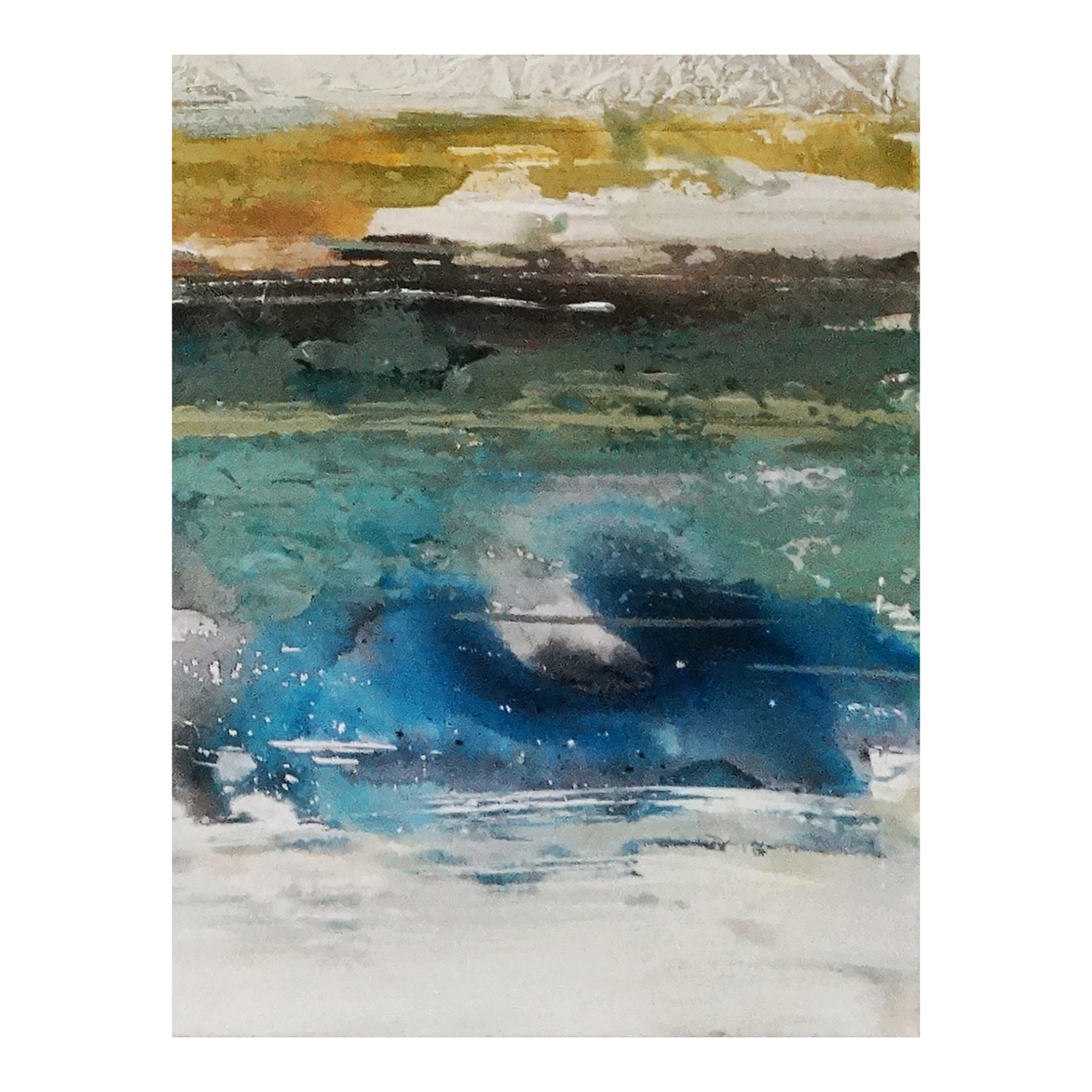 Add a designer look to your home with this acrylic on canvas painting. Vibrant blue, green, and gold tones are set on a neutral background that will make a room feel light and airy.
