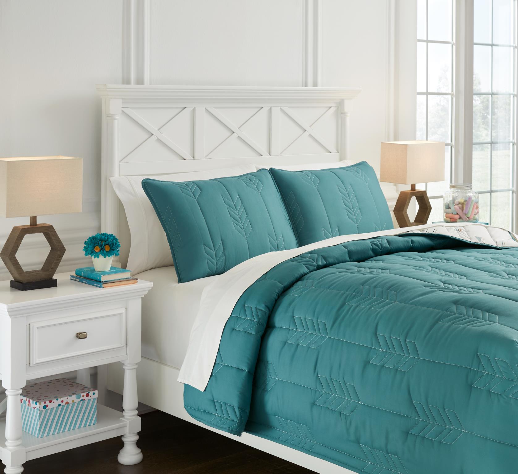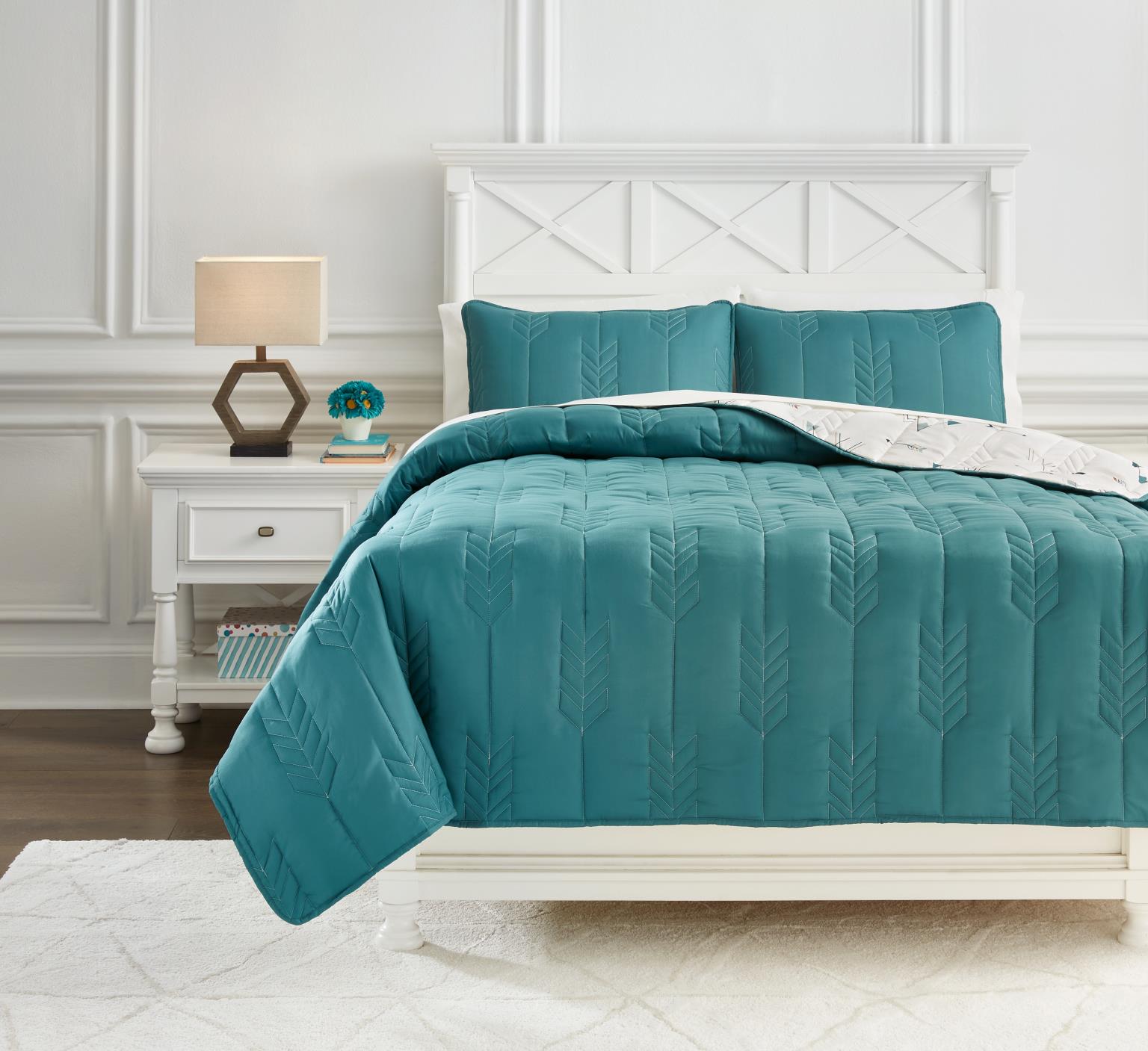 This bedding set features a solid stitched arrow print in teal,,,, reversing to a multicolored arrow print with abstract mountains in coordinating colors of teal,,,, white and gray. The stylish quilt set helps to create an incredible room for your child,,,, giving them the choice to change up their bedroom decor quickly and easily.