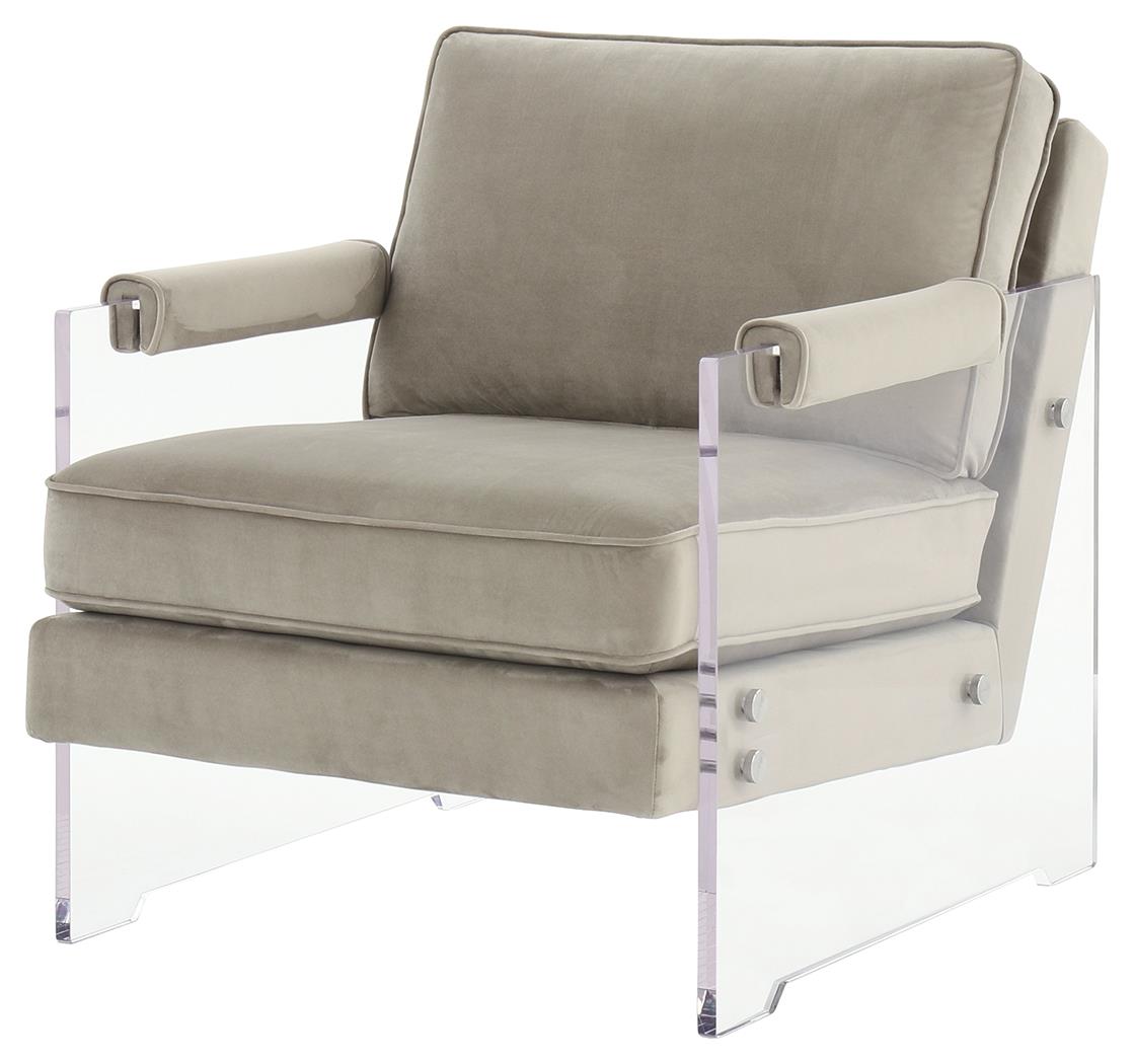 Looking for a spectacular addition to your home. This accent chair is where comfort meets fashion. The sleek, clear, modern lines and solid acrylic frame offer a light and airy feeling. The silvertone oversized metal bolts and deep comfortable seat add a stylish touch to the entire design. Upholstered in soft taupe velvet fabric with padded arm cushions for added comfort, this chair is well-proportioned to offer ultimate coziness. Sophisticated and comfortable, it will be the most stunning piece in your room.