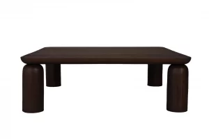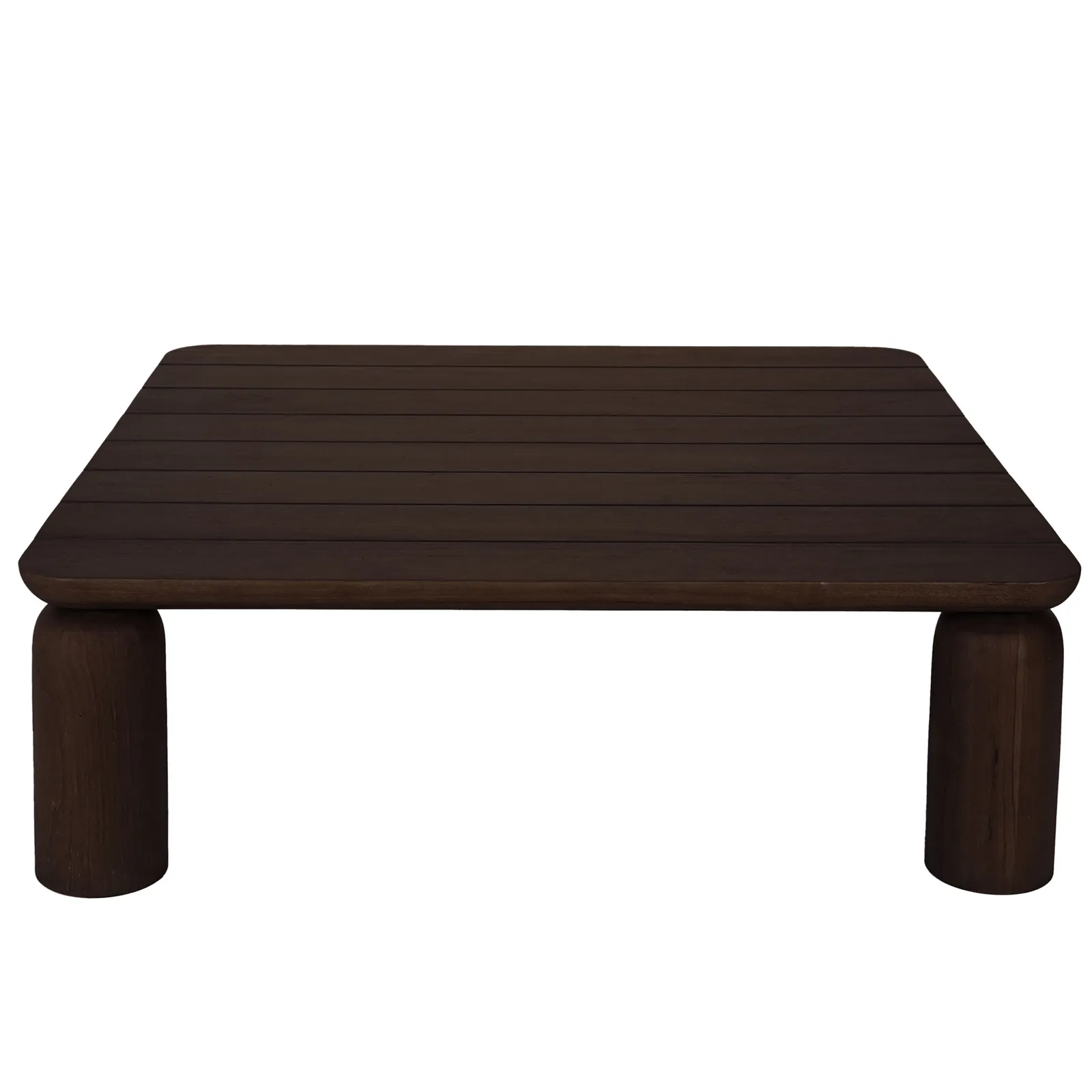 Durable and weather-resistant, the Barclay outdoor coffee table adds a playful touch to the outdoor space without compromising on elegance. This solid teak coffee table features a slatted top and round cylindrical legs in a toasted brown finish. Its unique design features a floating effect where the sloped top piece interacts with the legs, creating visual interest.