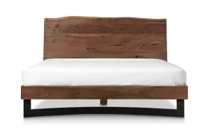 The Bent collection puts nature’s craft front and center. Made of beautiful solid acacia wood, rustic live edge detailing shows off the unique knots and whorls of the wood. An organic element for your bedroom, the Bent queen bed’s expansive live edge headboard is a showcase for the acacia. A bent iron piece adds an industrial juxtaposition to the natural elements. Pair with other pieces in the Bent collection for a complete look.