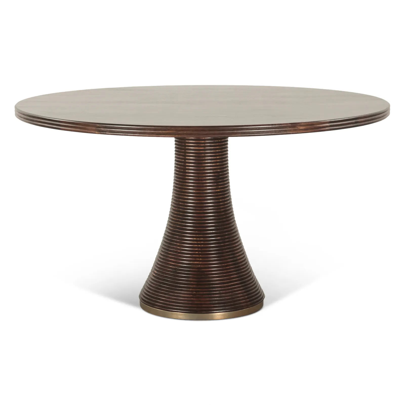The Bijou 54″ Round Dining Table in Dark Sienna combines sculptural form with modern elegance. Crafted with a fluted pedestal base and accented by refined metal detailing at the bottom, this table introduces depth and architectural interest to contemporary interiors. Its round profile encourages conversation, while the rich Dark Sienna finish offers a warm, sophisticated tone‚Äîideal for designers and wholesale buyers seeking standout pieces for curated dining environments.