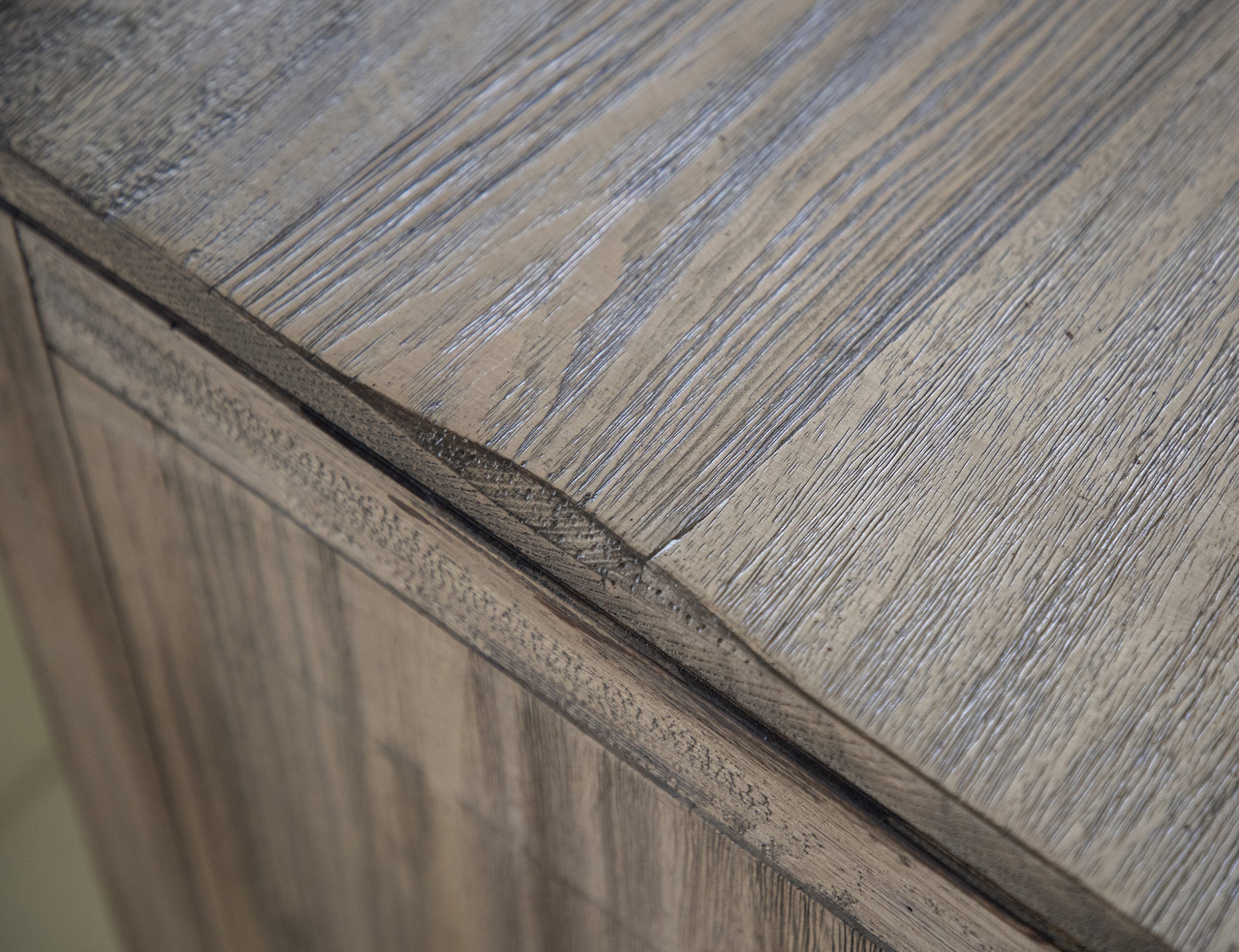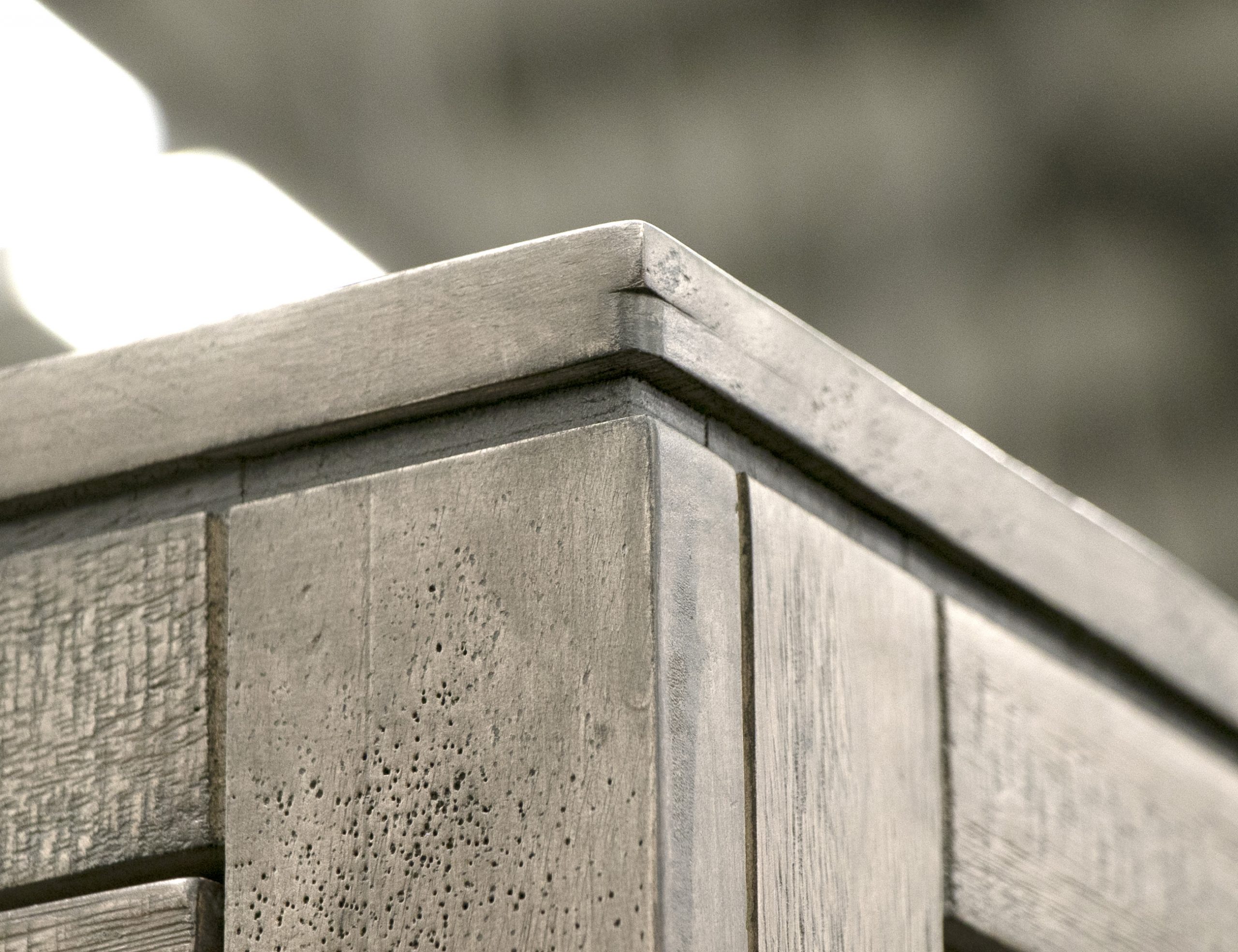 • Finish is achieved through a multi-step lacquer process, imparting a translucent light brown hue onto hand-aged wood.