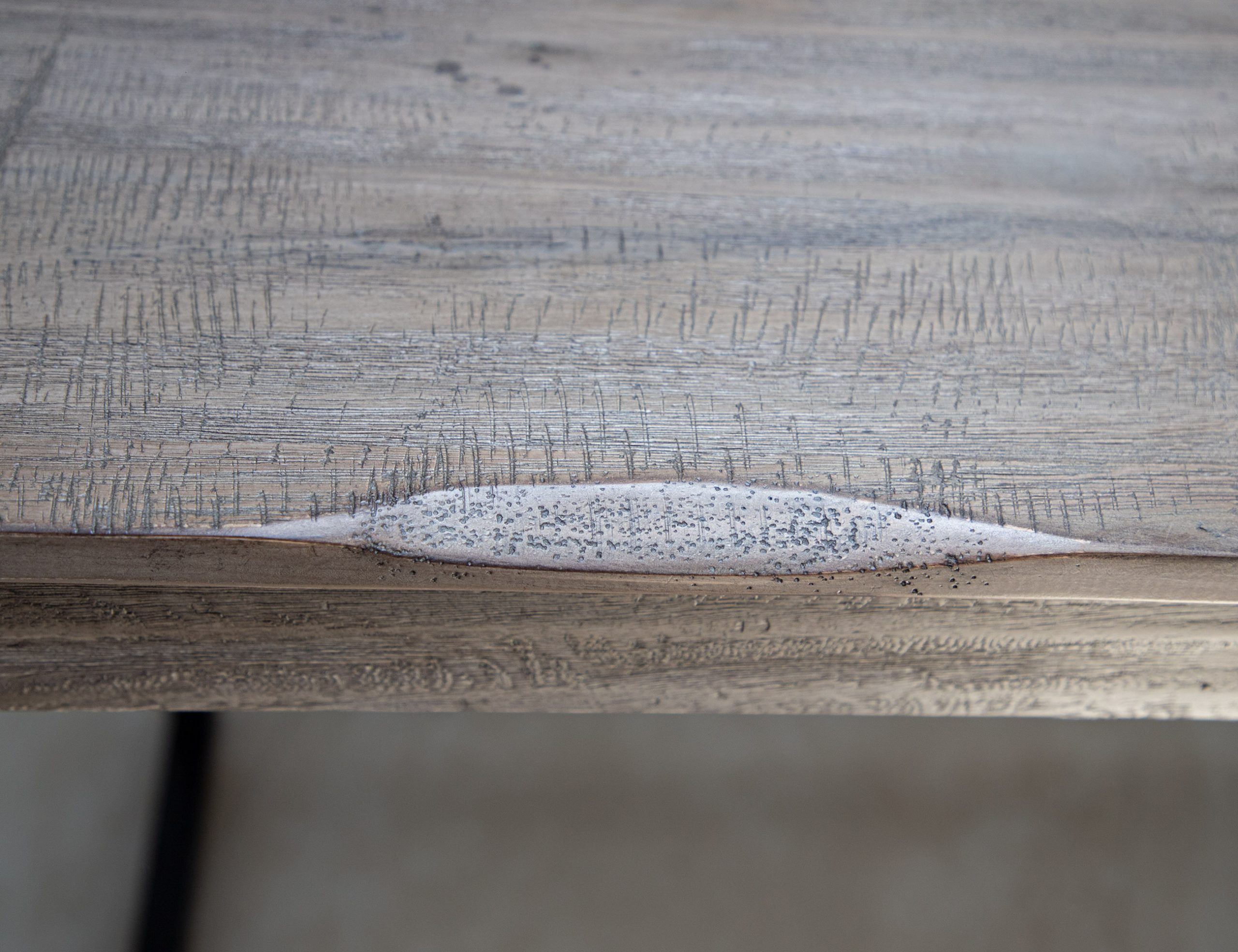 • Finish is achieved through a multi-step lacquer process, imparting a translucent light brown hue onto hand-aged wood.