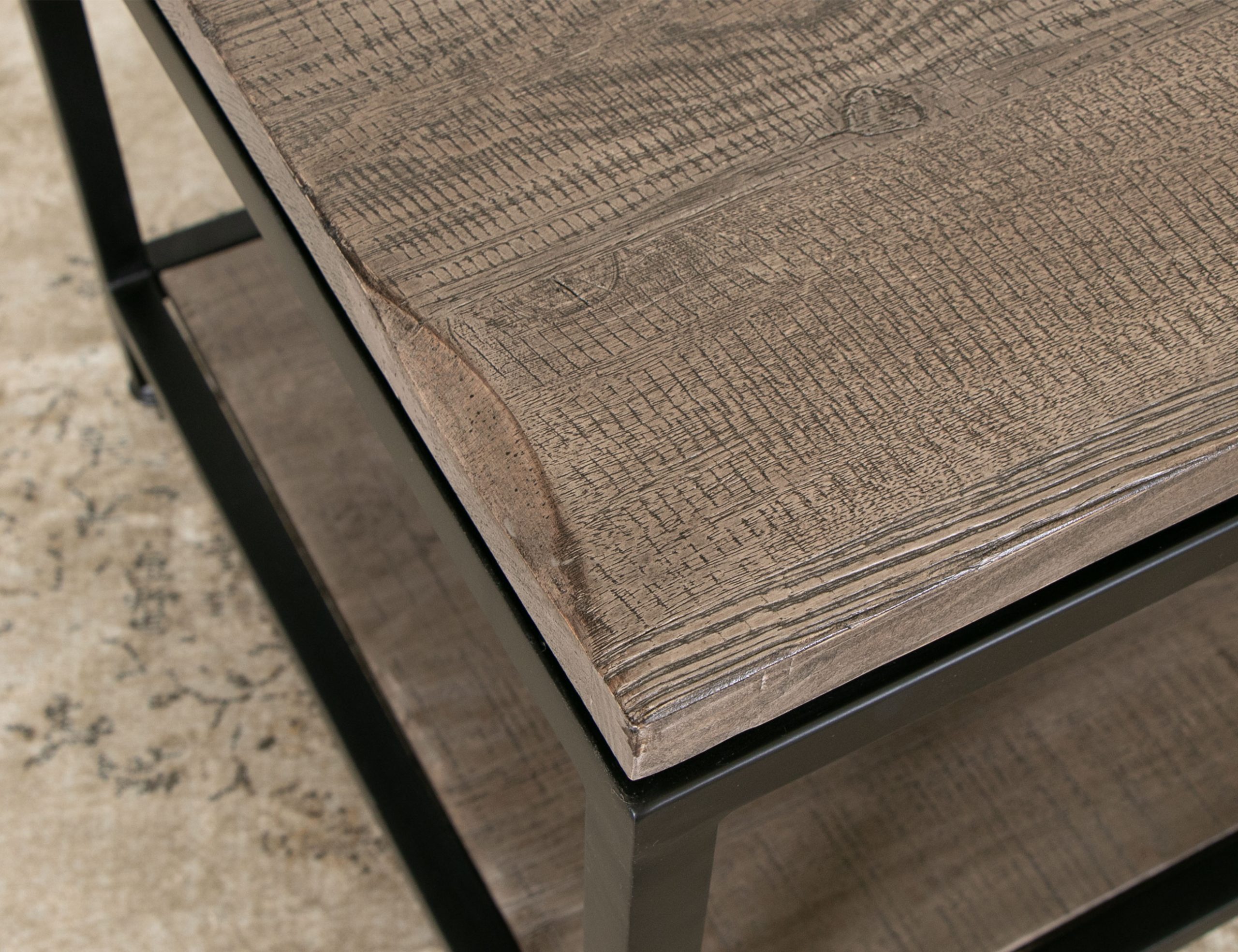 • Finish is achieved through a multi-step lacquer process, imparting a translucent light brown hue onto hand-aged wood.