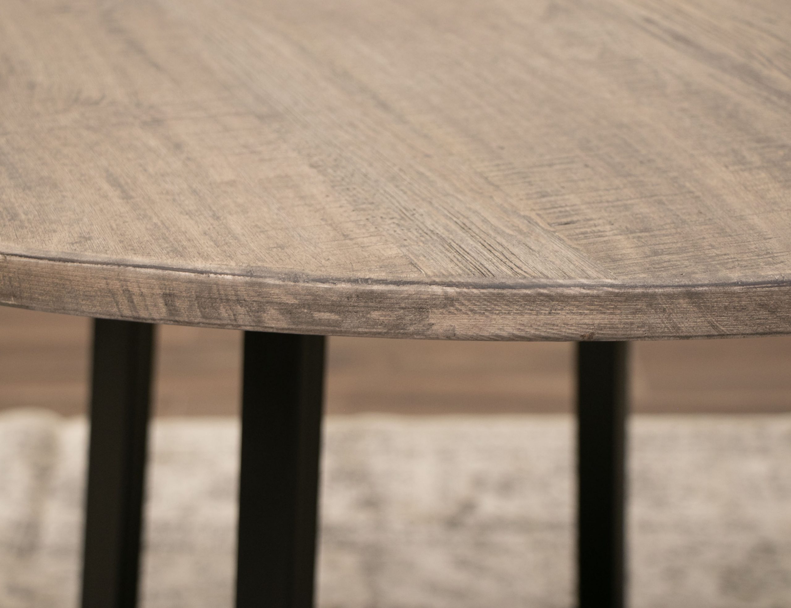 • Finish is achieved through a multi-step lacquer process, imparting a translucent light brown hue onto hand-aged wood.