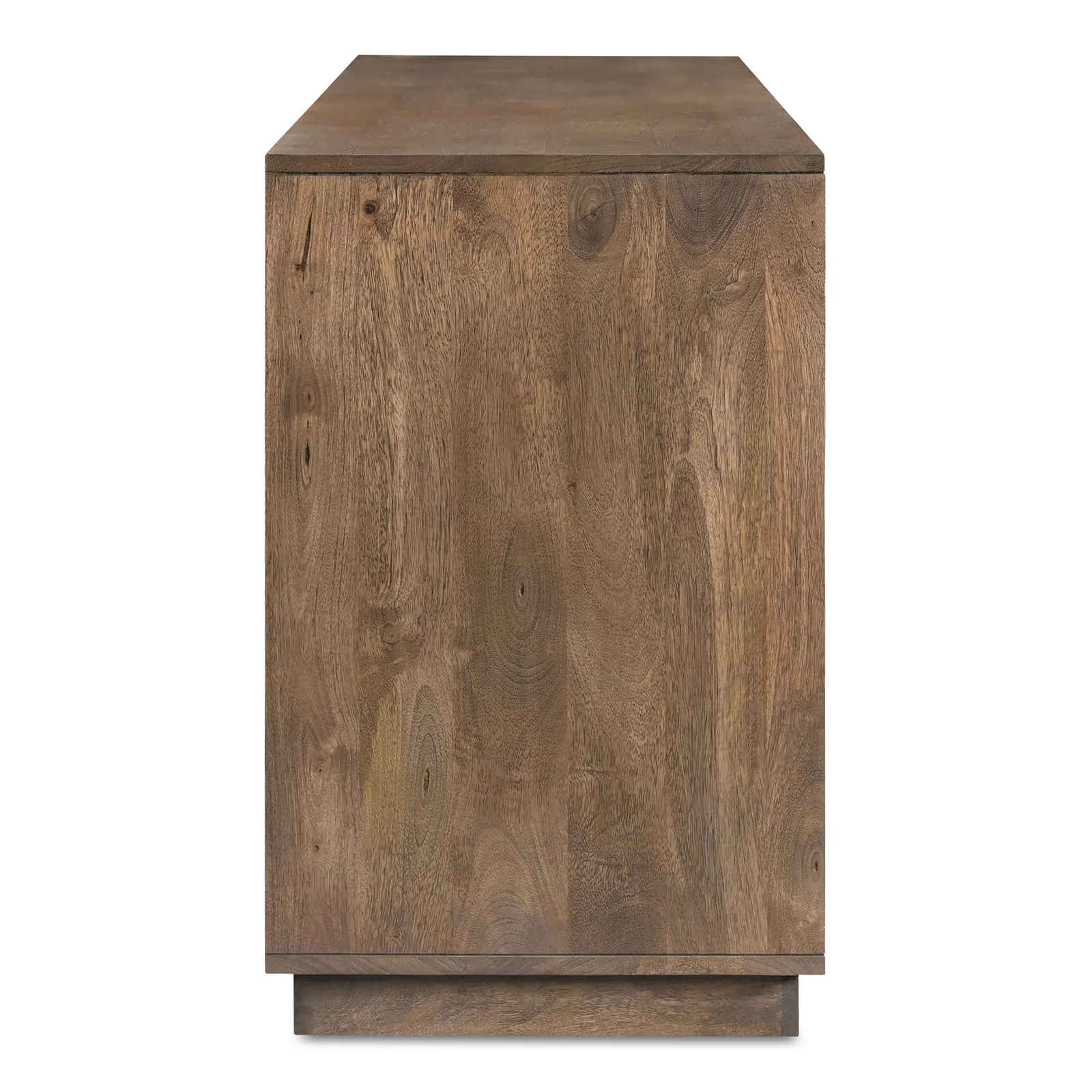 A minimalist storage option inspired by the architectural depth of an interior wall, the Bowen sideboard showcases simple geometry. Crafted from solid Mango wood with a matte sandblast brown finish, this piece features a simple, blocky silhouette that adds dimension. Four doors with magnetic catches reveal two adjustable interior shelves, bringing subtle functionality to any space.