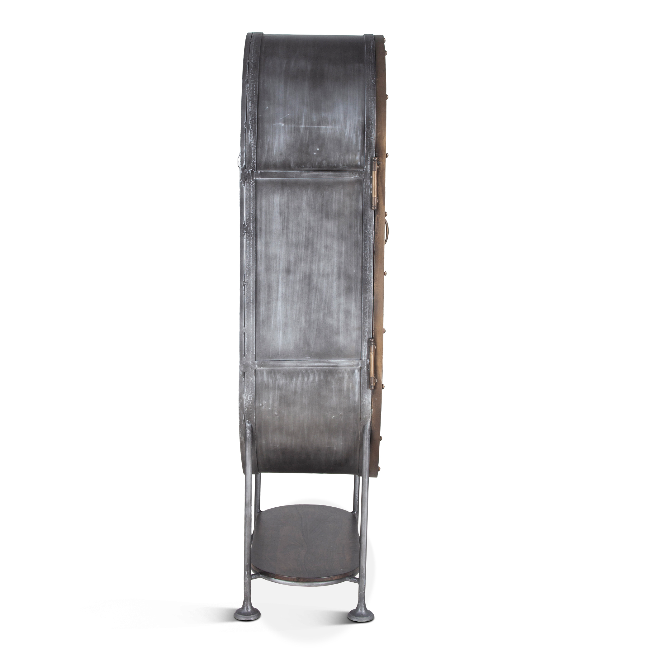This tall oval bar cabinet features a reclaimed iron frame with an antique brushed silver finish on the sides. Two glass doors, accented with a stand-out brushed bronze finish and stud detailing, open to reveal ample storage space for wines, spirits, and glasses. The cabinet includes three shelves, glass and wine racks, and an acacia wood drawer for storing bar accessories like keys, napkins, and corks.