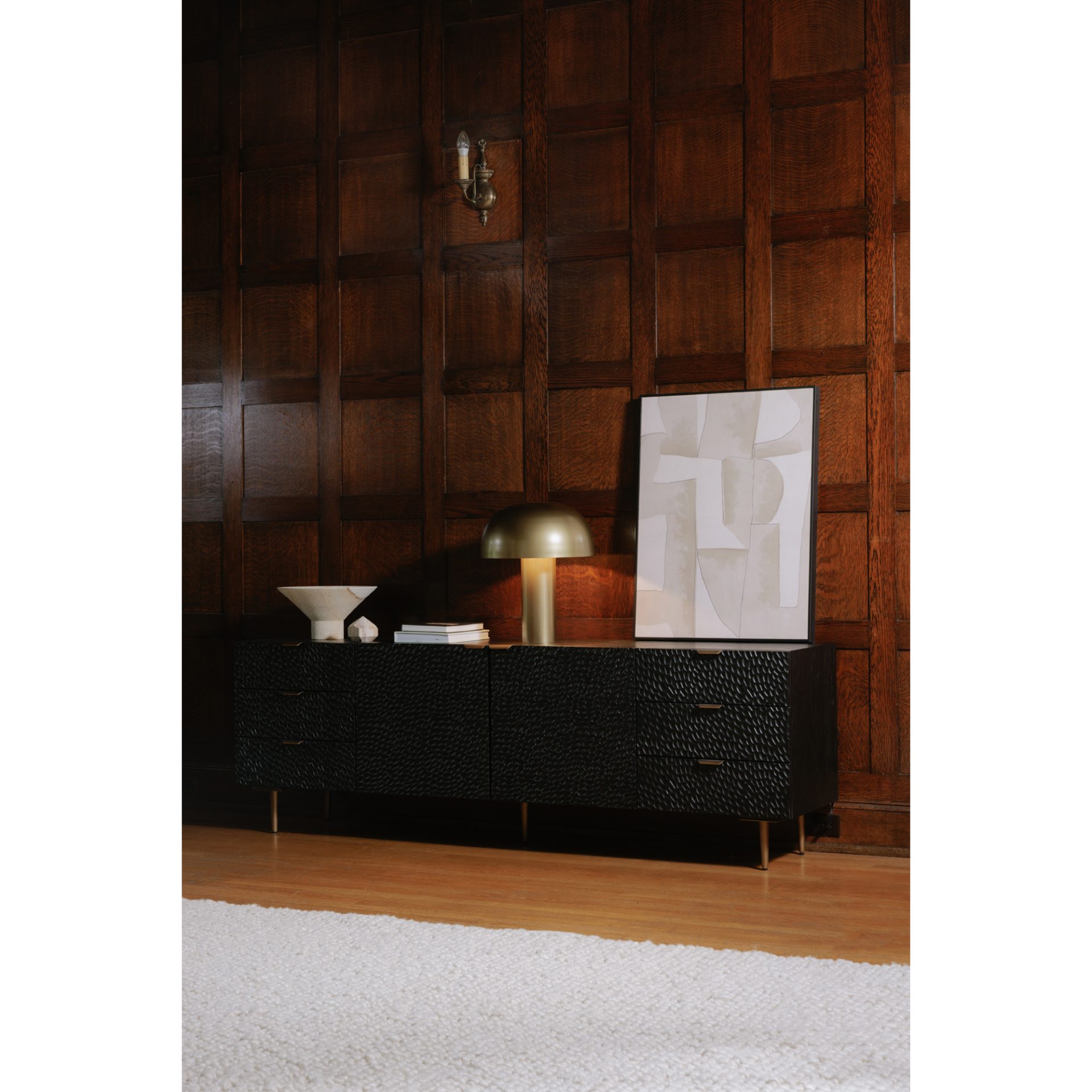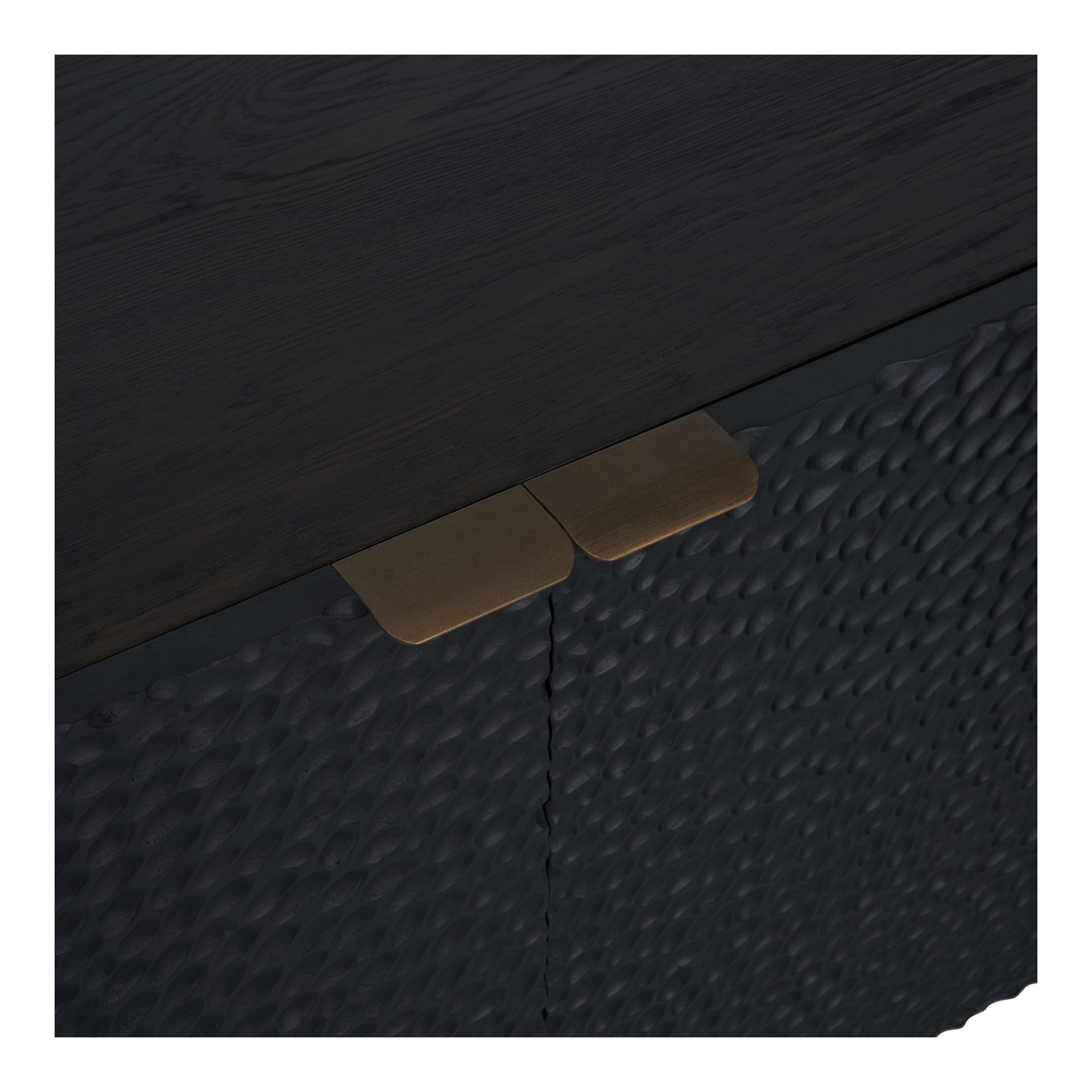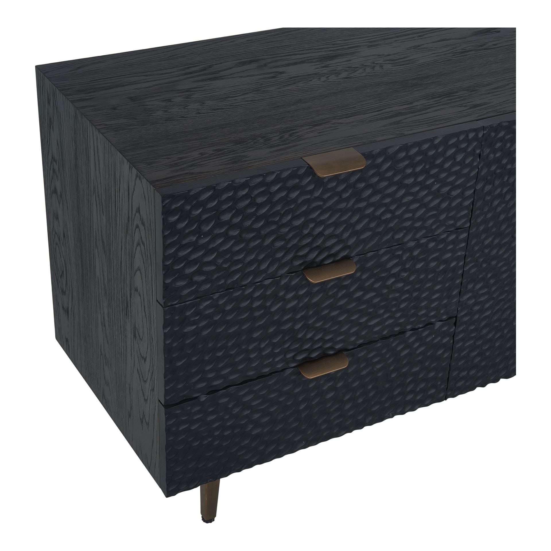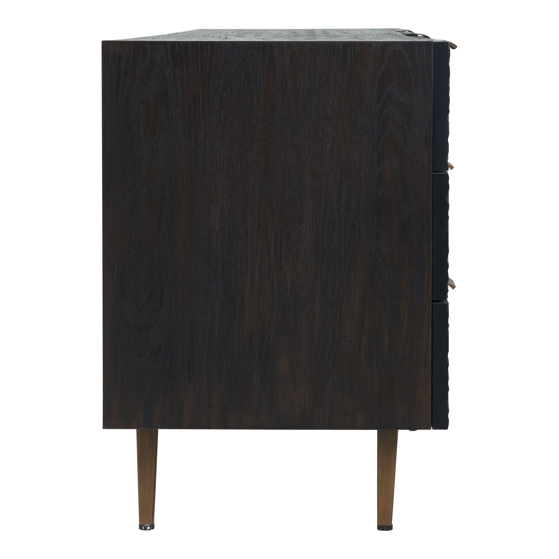 A distinguished silhouette for the dining room. Cutting a suave profile in black and gold, Breu’s textured front façade features relief carving that adds an elegant, sculptural quality. Solid oak construction offers natural touches, while six drawers with side mounted, soft-close door glides, and two large cabinets with adjustable shelves provide storage for all your dining accessories. Slender, understated legs and gold-finished handles are the finishing touches on this dusky dinnertime affair.
