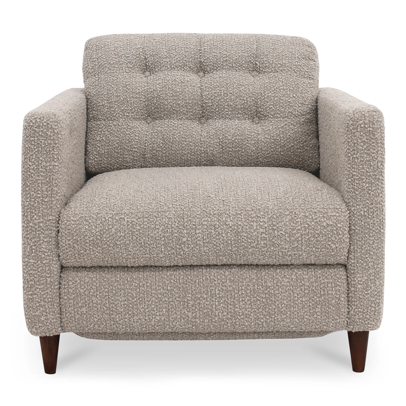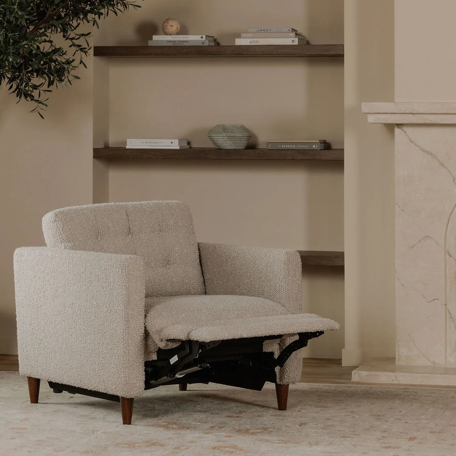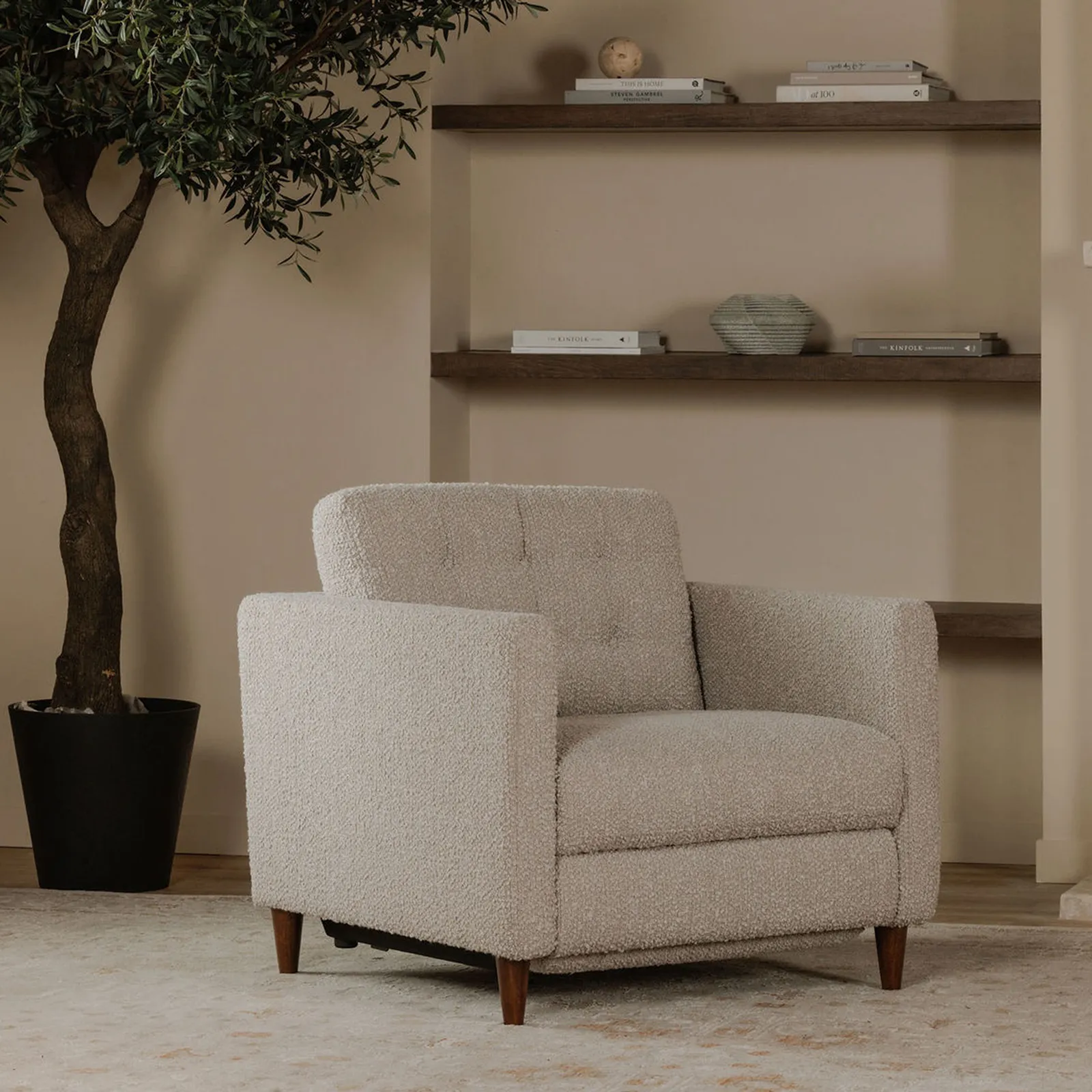The Bridgers power recliner chair’s slim frame features an Okin power motion recliner lift with a 52.5″ power cord with a 3.5m extension cable. Wrapped in sumptuous bouclé fabric, it presents a tactile sophistication with its contemporary comfort.