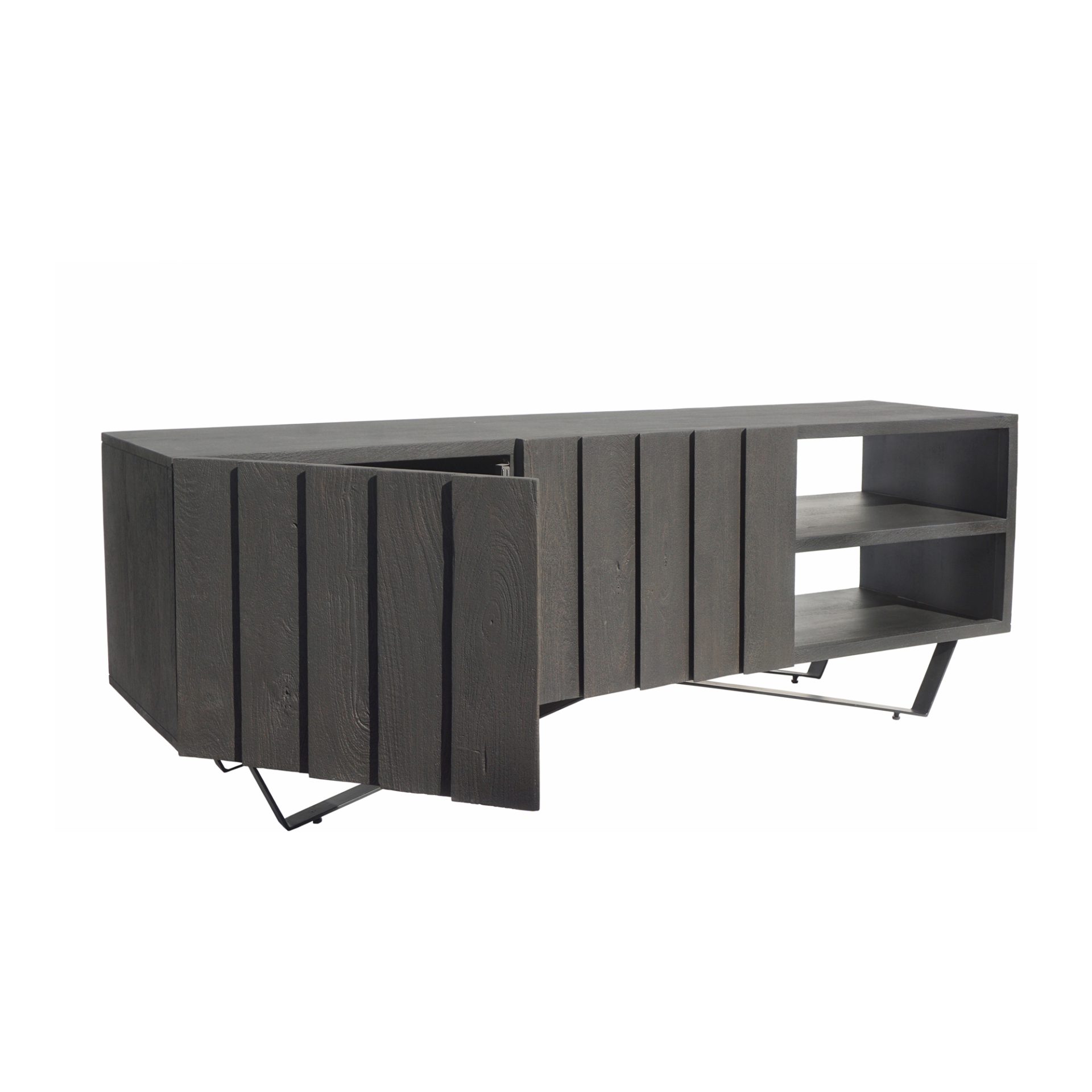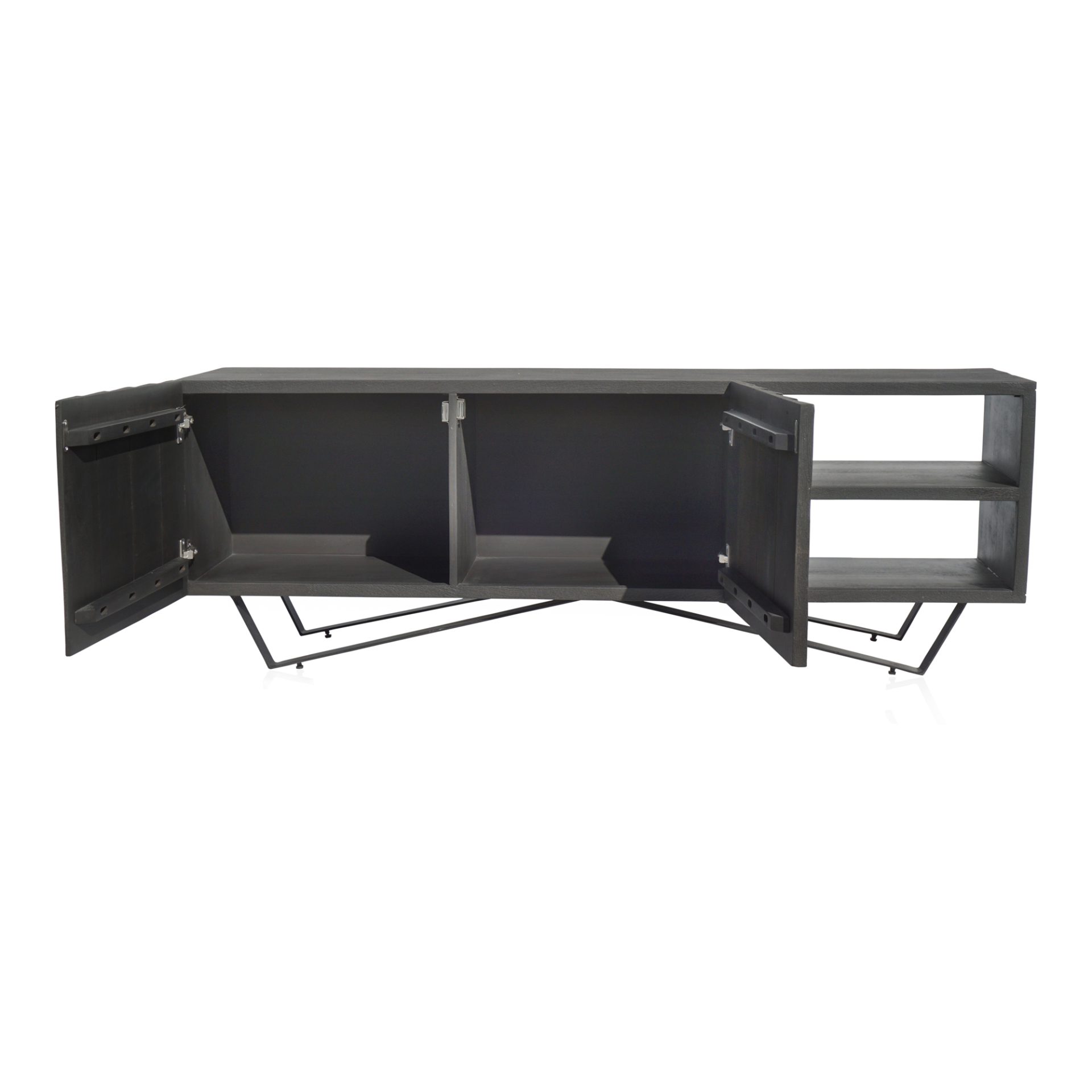 Invite darker hues and decorative introspection into your space with the Brolio collection. Solid, dark-hued mango wood cuts a dramatic profile, while sturdy iron legs bring sculptural elegance to satisfy those artsy cravings. The Brolio media console’s 2 easy-open doors swing wide to reveal a spacious storage area, and its open concept shelf is a neat and convenient home for any media device. An ideal centerpiece for your entertainment setup, pair this piece with others from the Brolio collection for a complete look.