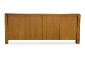The Brook sideboard blends a blocky silhouette with a visually light, undercut top that appears to float on its strong, thick legs. Crafted from solid oak and clean oak veneer door fronts, its mid-tone brown oak finish, enhanced by wire brushing, offers a rustic flair that complements various interior styles.