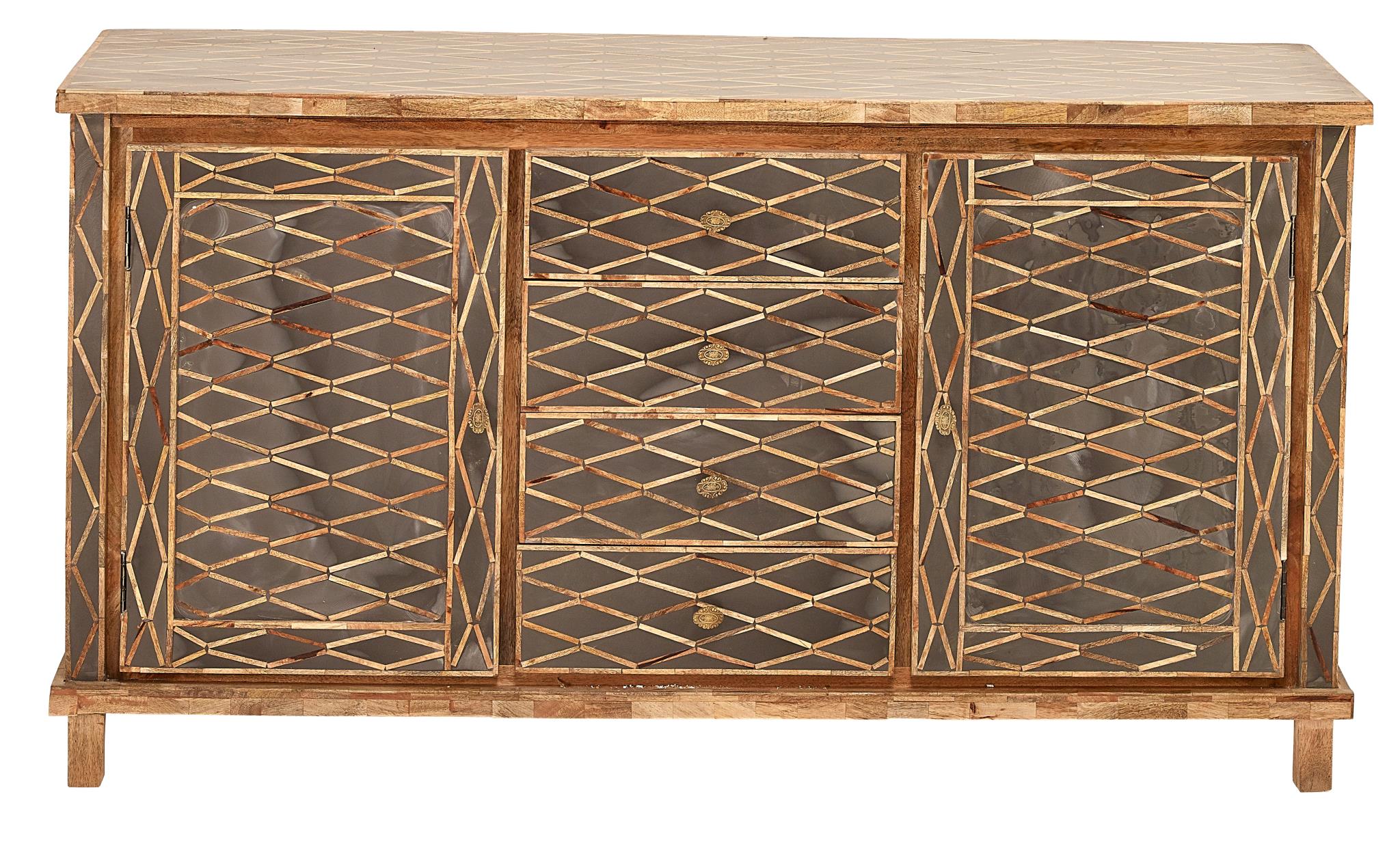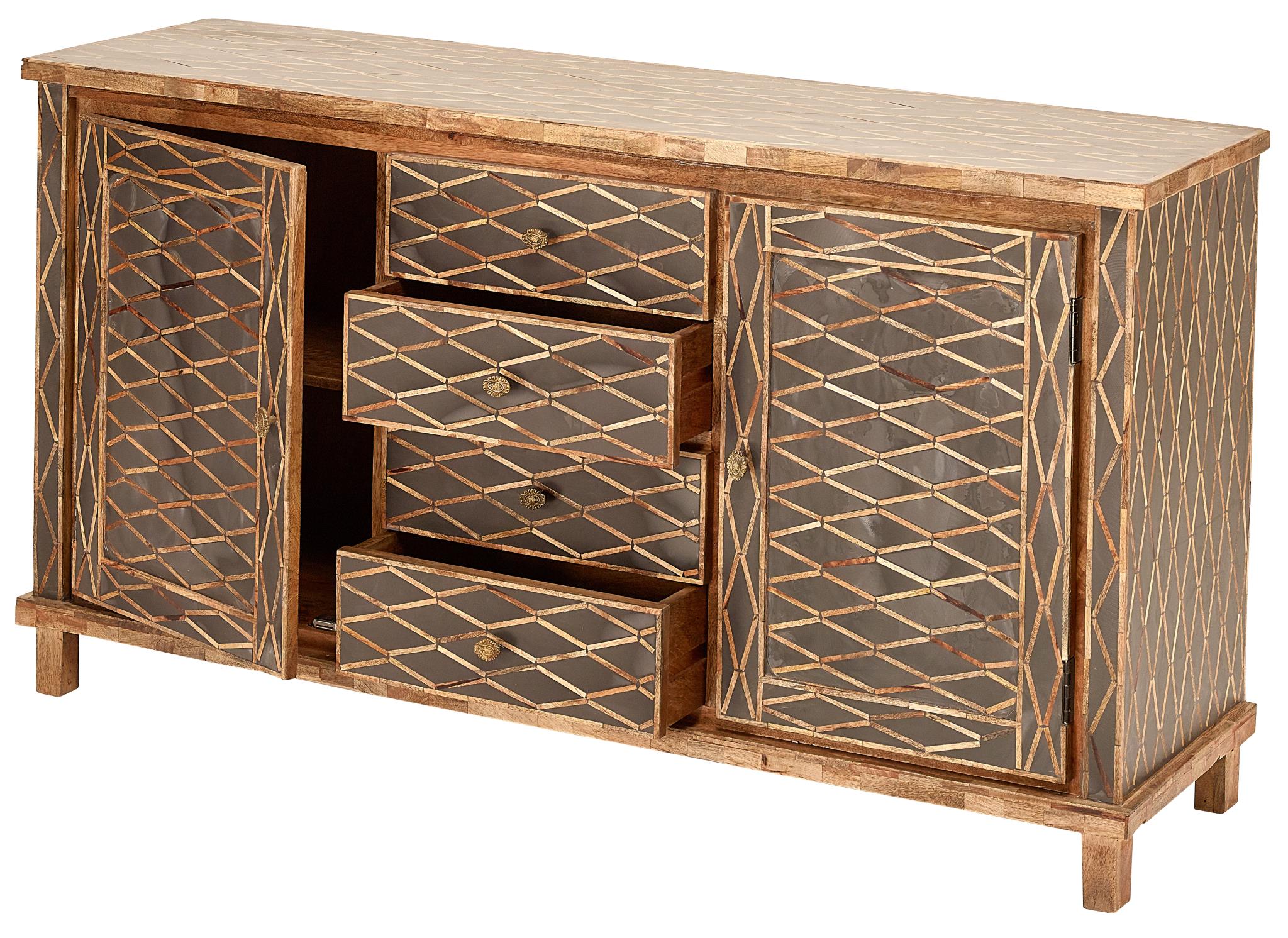This “sideboard” is constructed,, using tongue and groove joint methods,, of mango timber in a blended finish. The detail is achieved by hand carving the design in relief style-and then filling the void areas with dark resin. The knobs are in an antique brass finish.