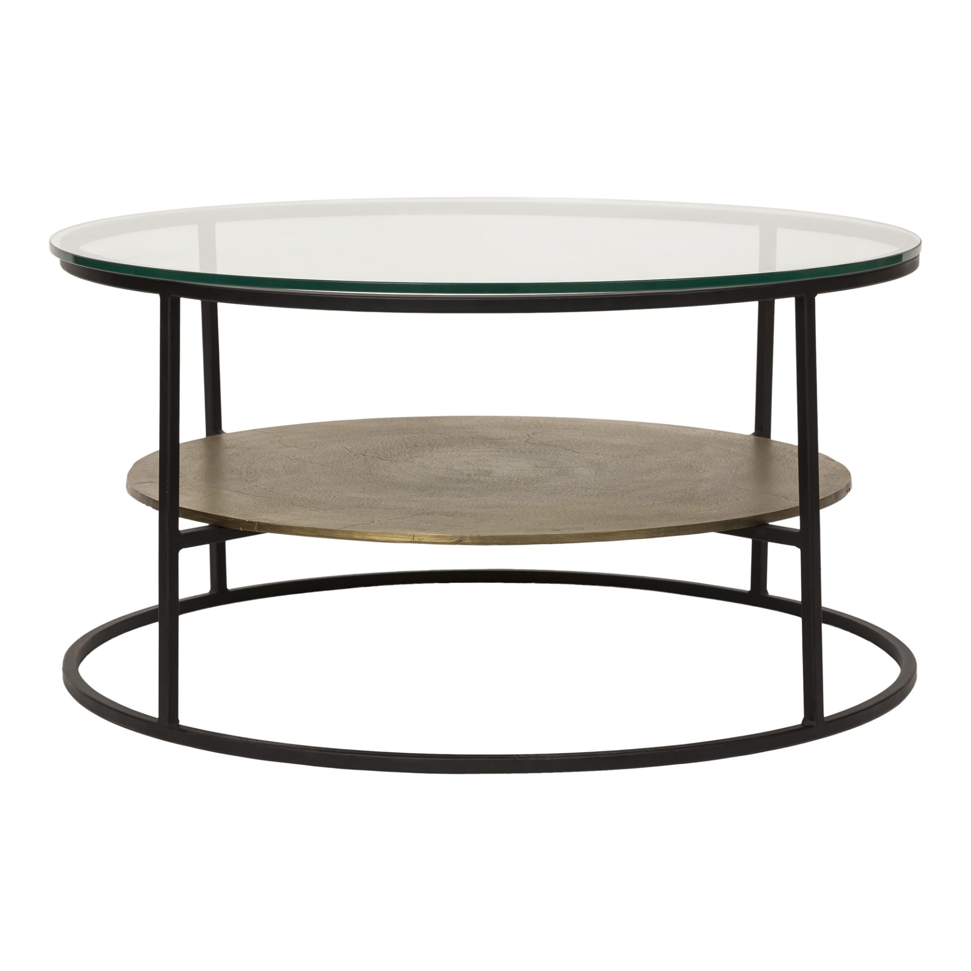 The stylish Callie Coffee Table features a circular design with a fixed metal shelf in a brass finish, visible through the tempered glass top making it light and sleek.