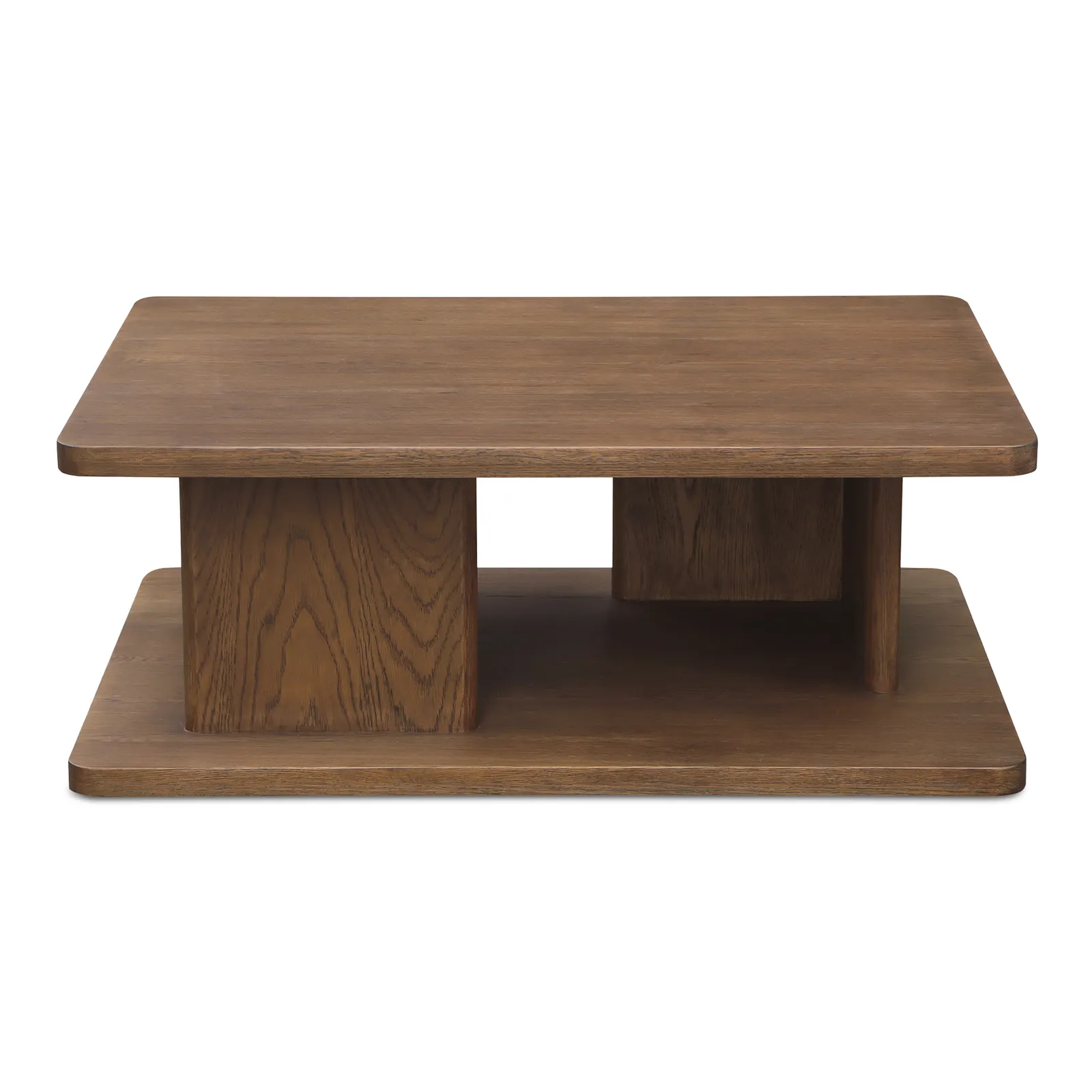 The Casey coffee table harmoniously blends rustic charm with contemporary aesthetics. A distinctive vertical support adorned with a refined bullnose edge adds sculptural grace to its minimalist design. Ample open storage beneath the tabletop offers practical display or storage solutions.