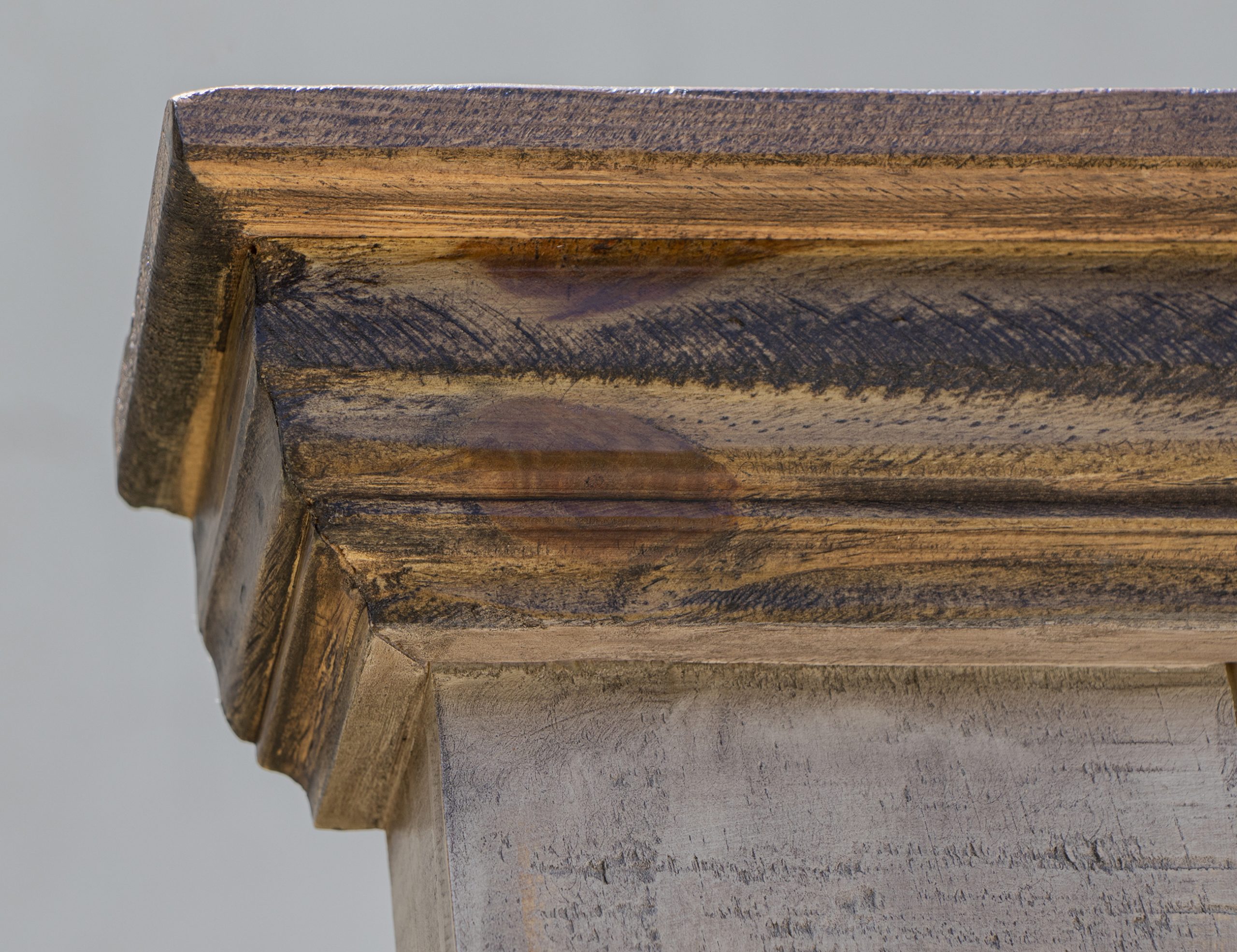 • Finish is achieved through a multi-step lacquer process featuring weathered gray and natural brown tops.