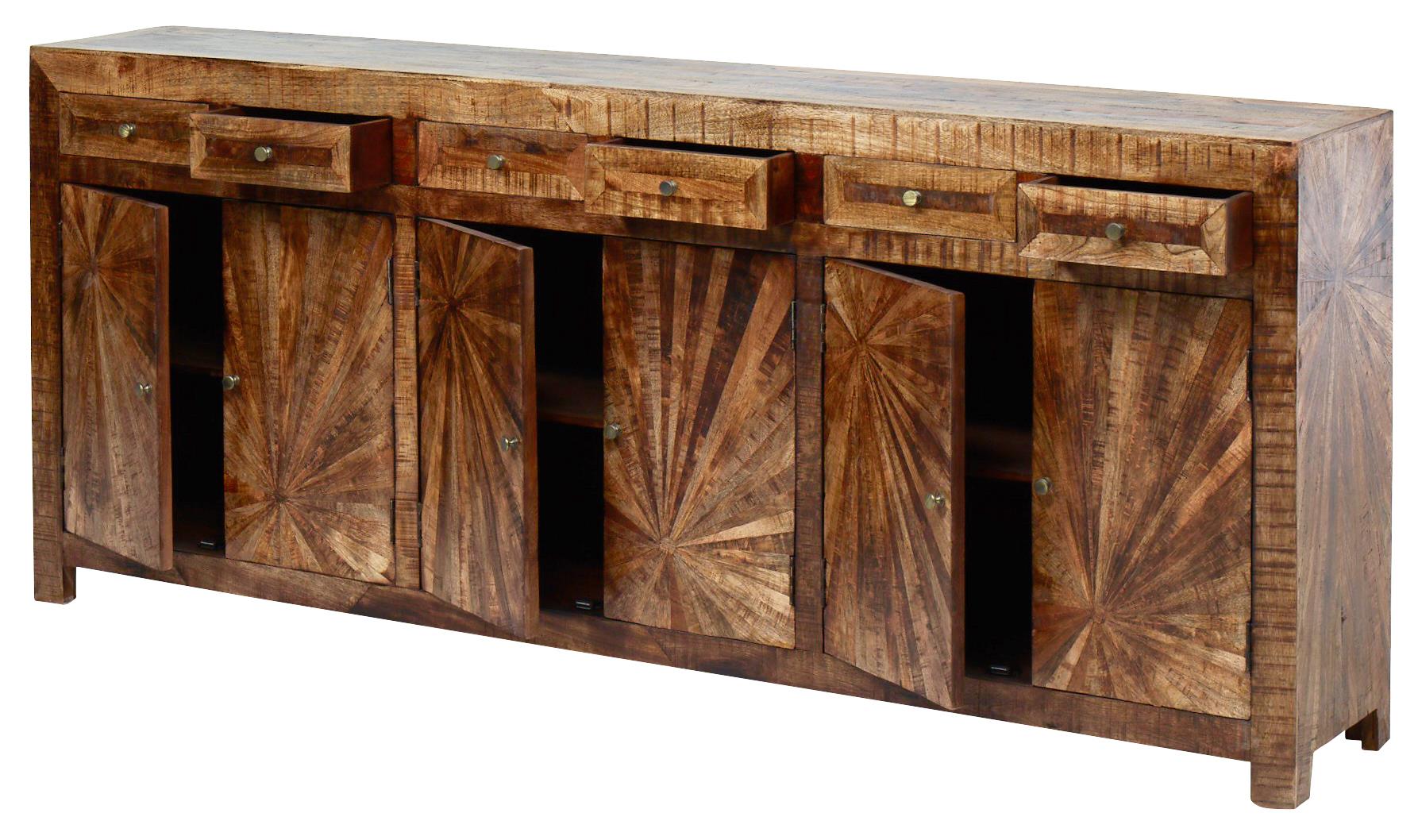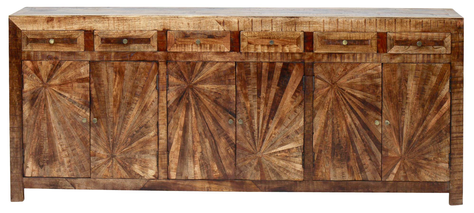 The Cayley group is constructed of mango wood and features a burnished hand-distressed finish. A solid case is built,, and then the pinwheel effect is achieved using additional strips and circles of wood painstakingly hand set in a pleasing pattern. An impressive 97 inches long,, the Jumbo Sideboard has 6 drawers and 6 doors which open to reveal shelved interior compartments.