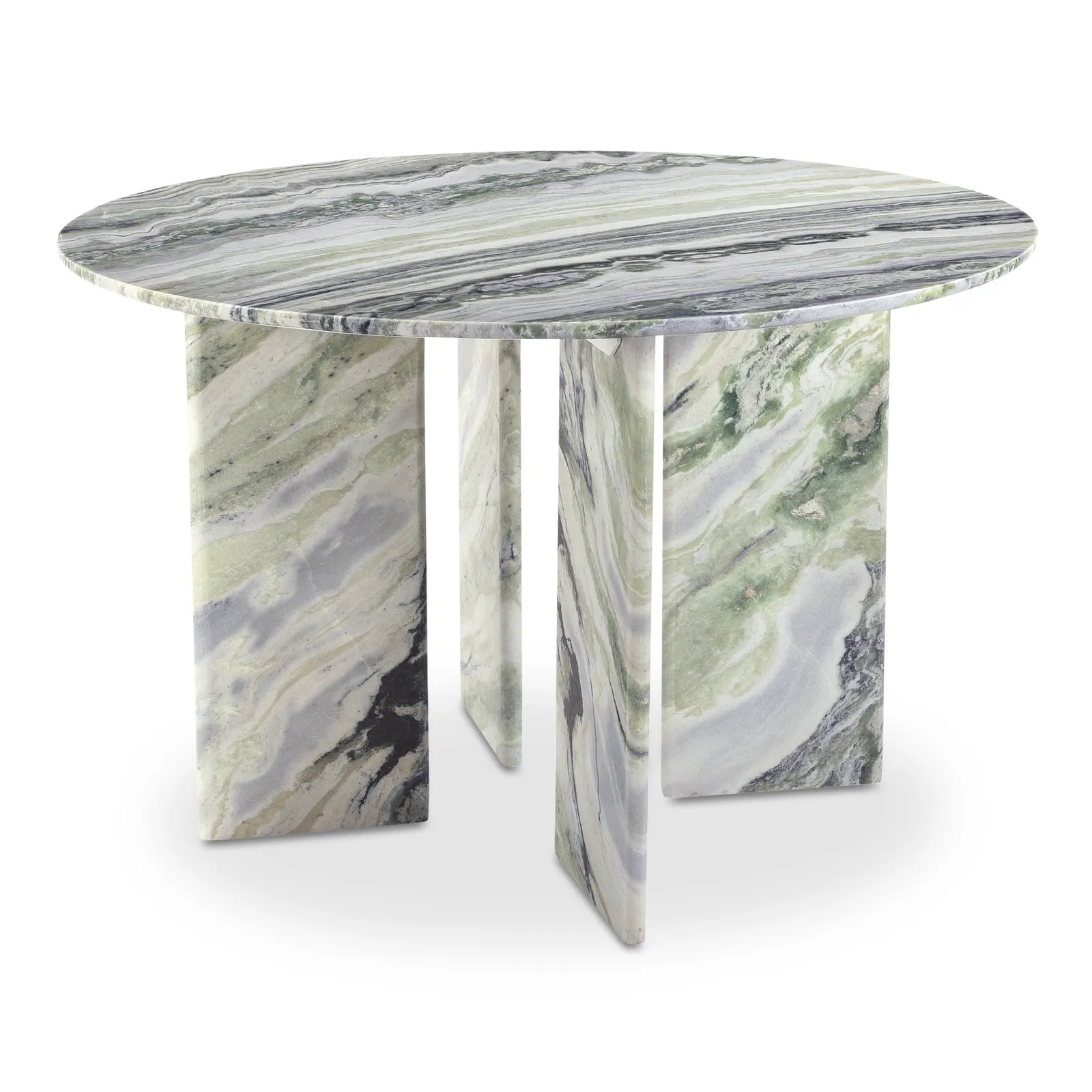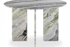 The Celia round dining table effortlessly combines contemporary flair with a timeless silhouette. The table’s allure is further enhanced by expressive green onyx panda marble, adding a touch of artistry and opulence. The smooth and organic textures on the marble beautifully contrast with the table’s geometric base, creating an intriguing visual harmony and exuding an undeniable sense of elegance and versatility.