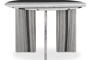 The Celia round dining table effortlessly combines contemporary flair with a timeless silhouette. The table’s allure is further enhanced by expressive white panda marble, adding a touch of artistry and opulence. The smooth and organic textures on the marble beautifully contrast with the table’s geometric base, creating an intriguing visual harmony and exuding an undeniable sense of elegance and versatility.