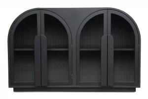 Inspired by the simple elegance of French Cleat handles, the Charlotte tall cabinet features a captivating two-tone design with a sleek black outer frame and natural interior. Tempered glass doors offer a stylish, protective showcase, while three interior drawers neatly store smaller belongings. With its modern and versatile design, this piece balances practical storage with graceful display.