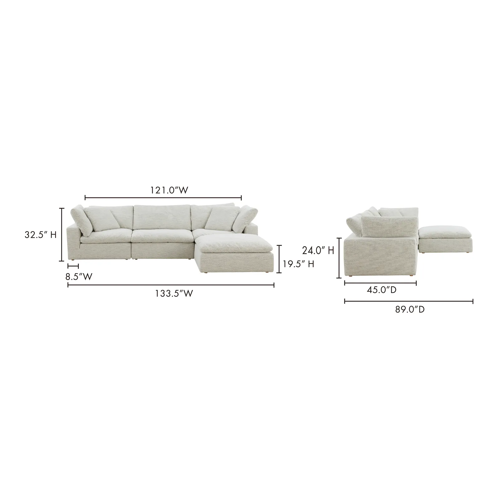 - Consists of 4 modular parts: 2 corner, 1 slipper & an ottoman for easy switch around