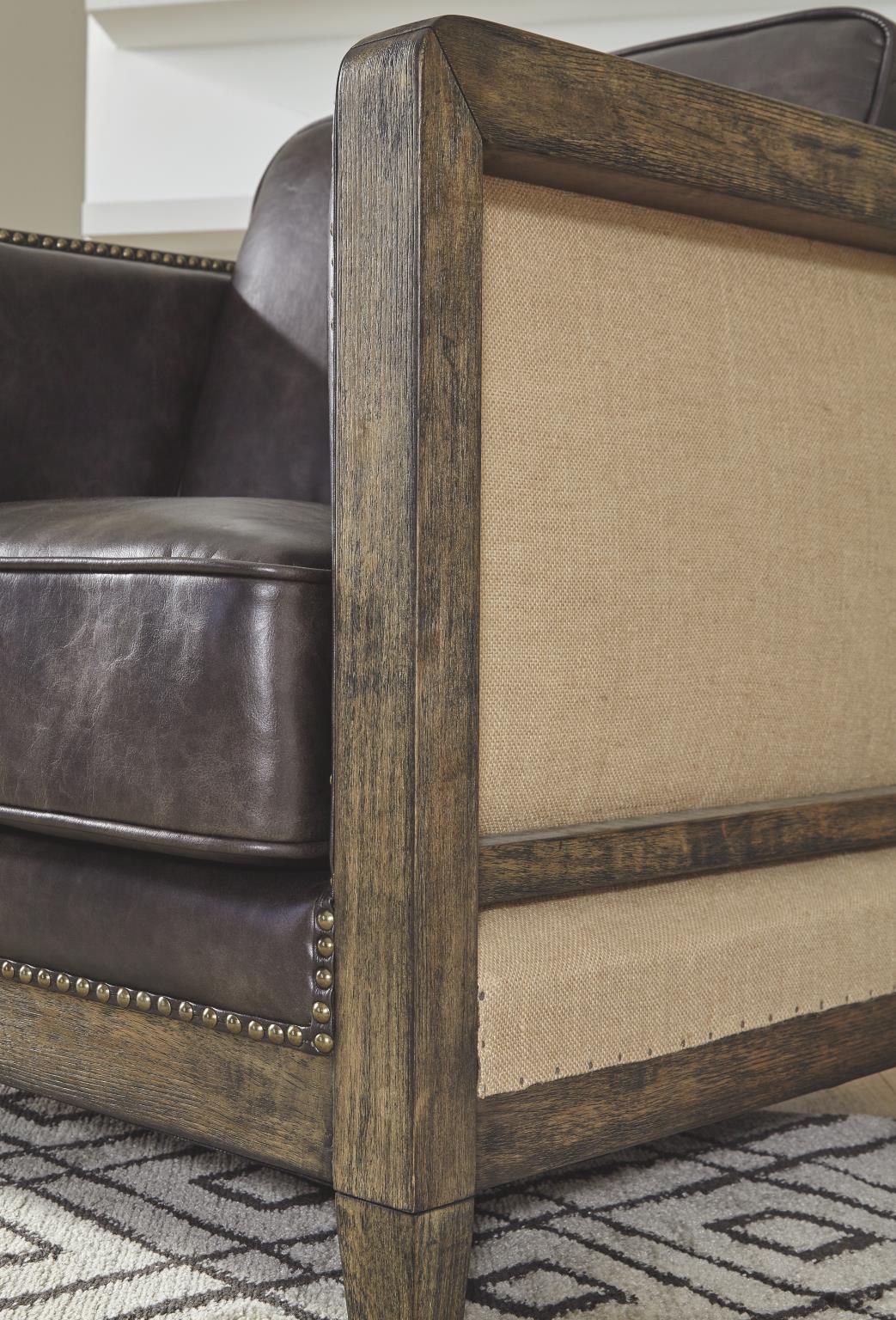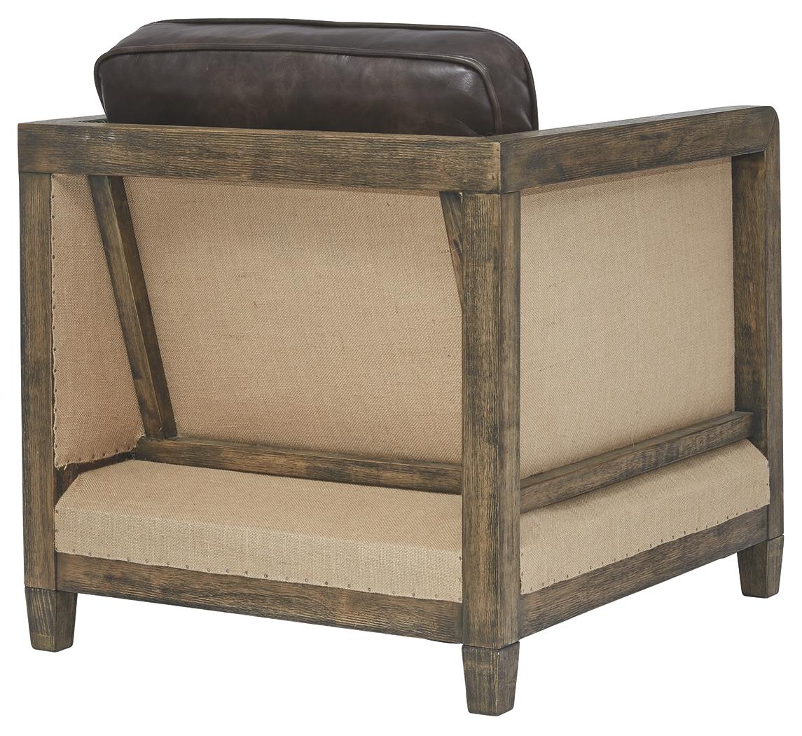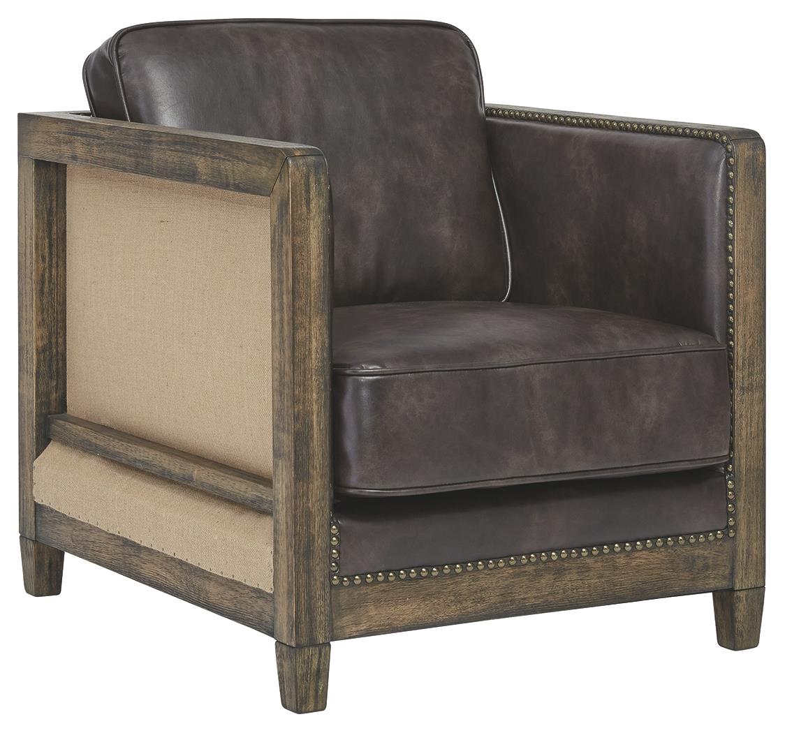 This accent chair with shelter arm styling makes it so hip to be square. An inspired take on deconstructed design, this chair combines an antiqued brown wood frame with a two-tone upholstered effect. The combination of brown faux leather and burlap fabric makes for one cool contrast. Antiqued brass-tone nailhead trim provides a punch of character and finishing touch.