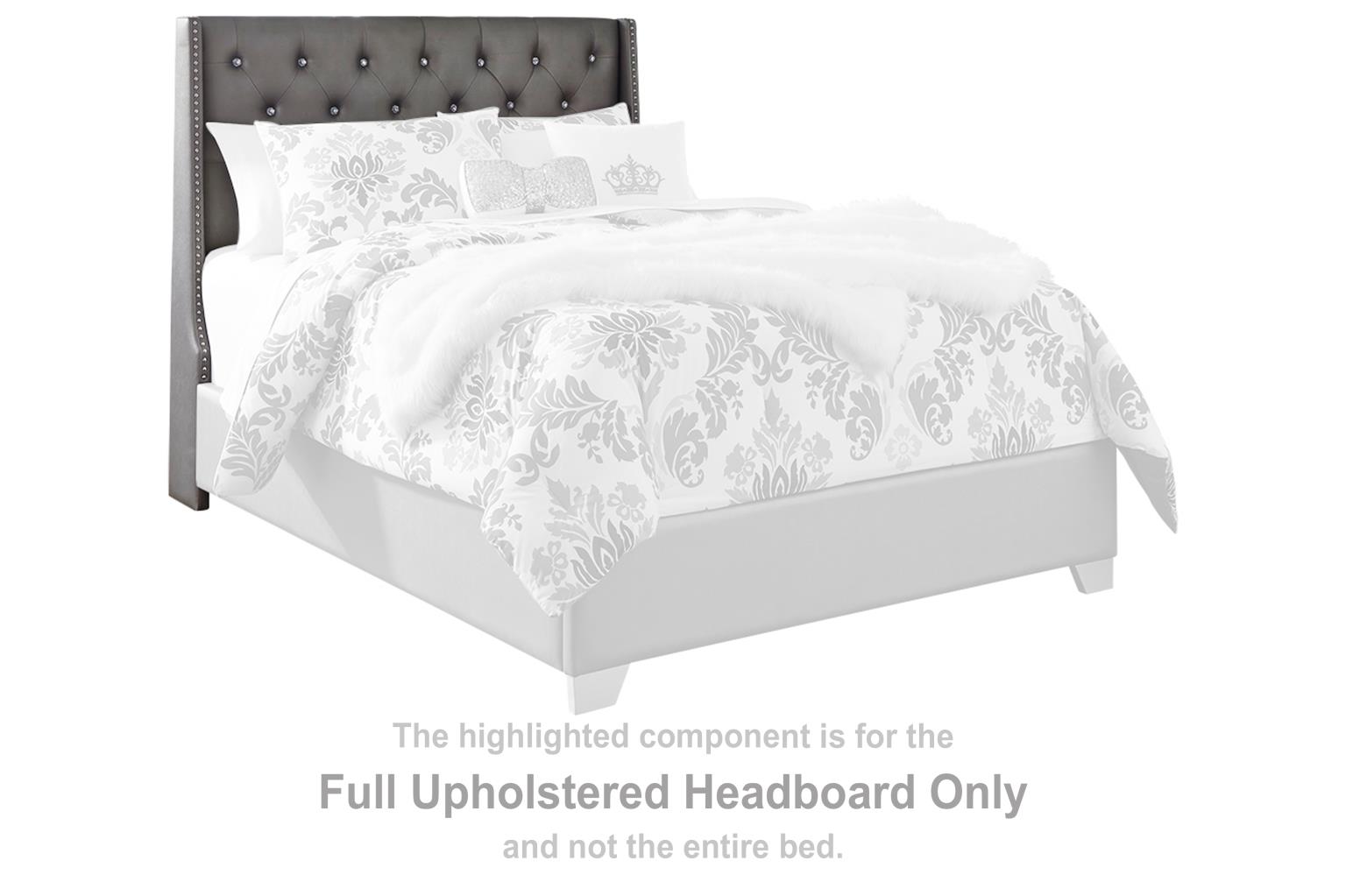 This upholstered headboard allures with the glitz and glam befitting silver screen queens. Textured gray vinyl upholstery channels that upscale flair you’ve been dreaming of. Generously scaled headboard with crystalline buttons will have you feeling sheltered in comfort and luxury.