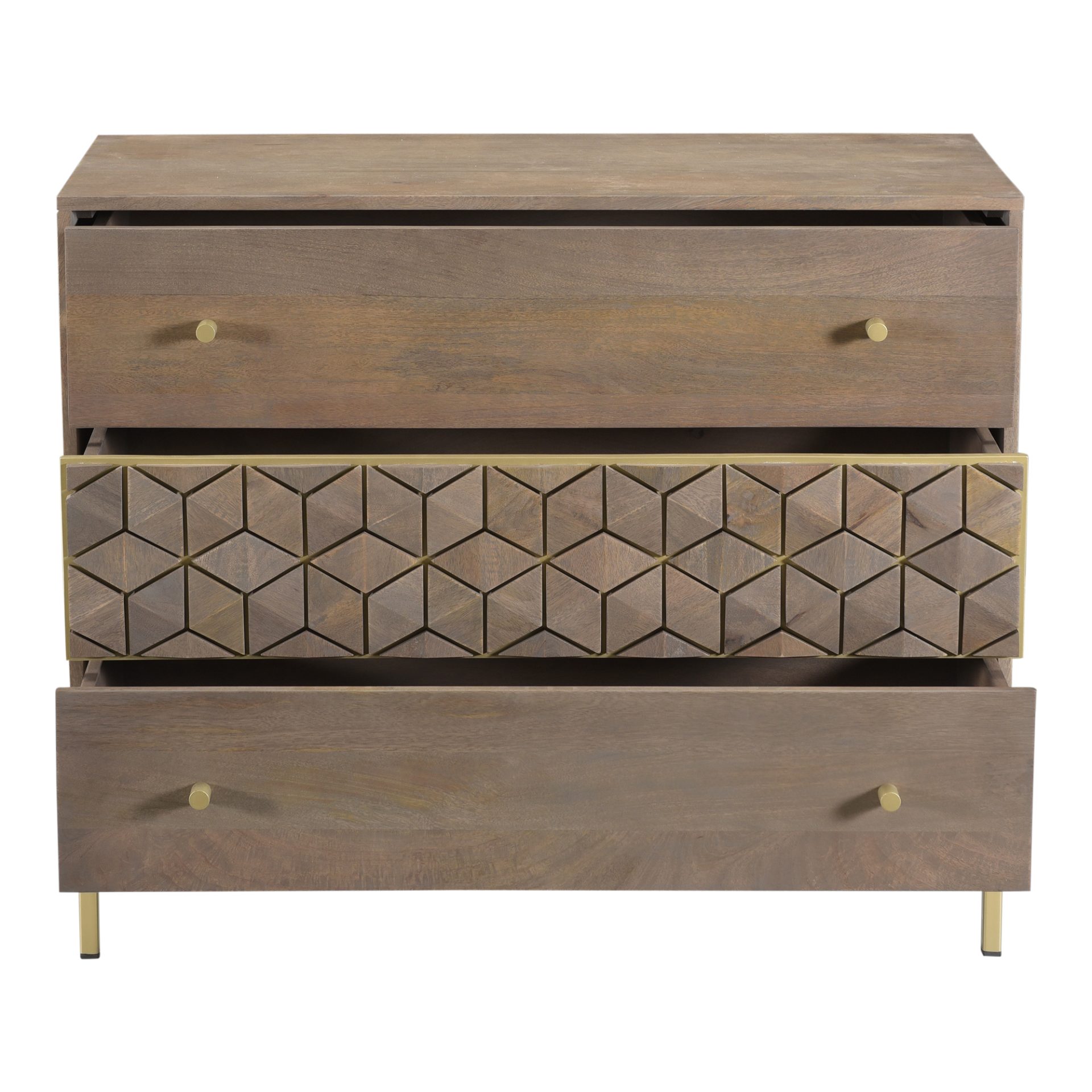 The Corolla drawer chest is an art deco-inspired with a modern twist. Constructed with solid mango wood, this piece makes it resistant to major wear and tear. Its warm tone and intricate drawer fronts and brass detailing provides character and practicality into your bedroom space.