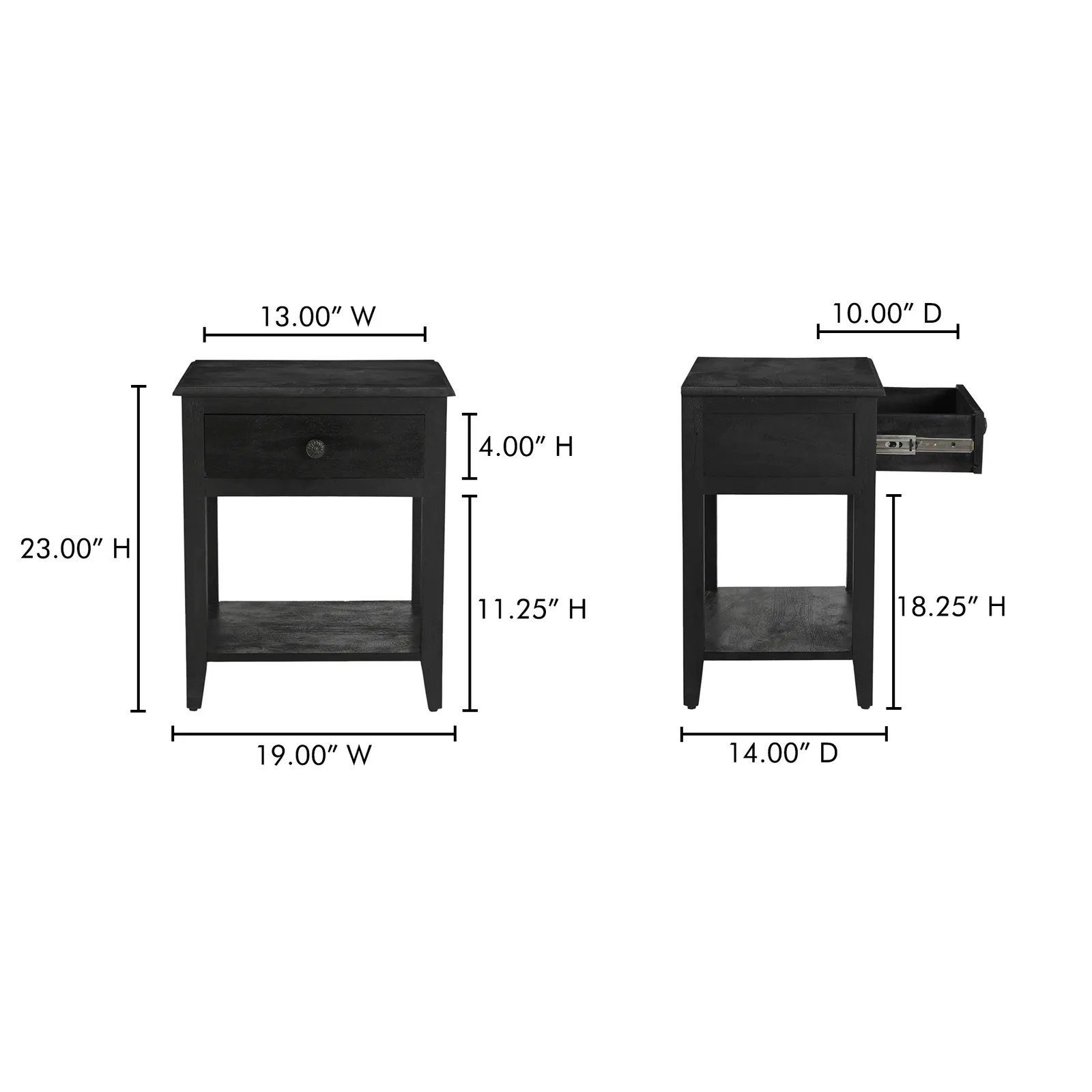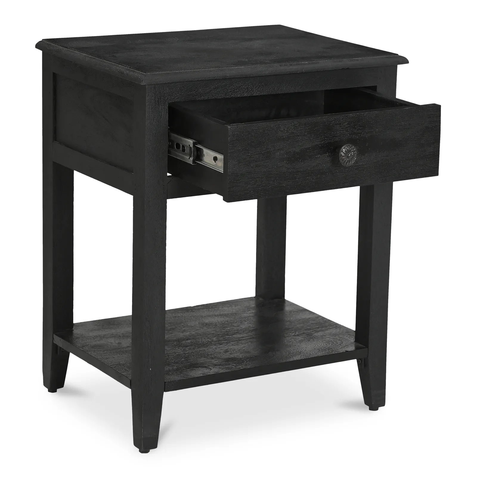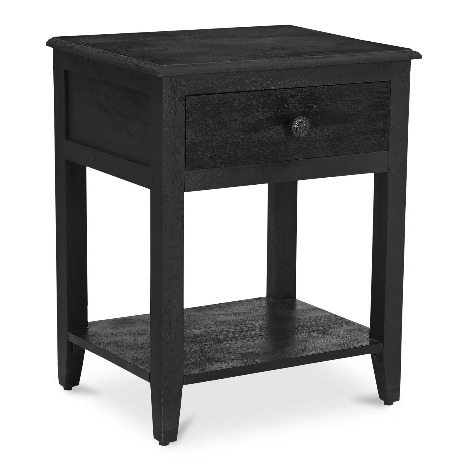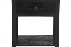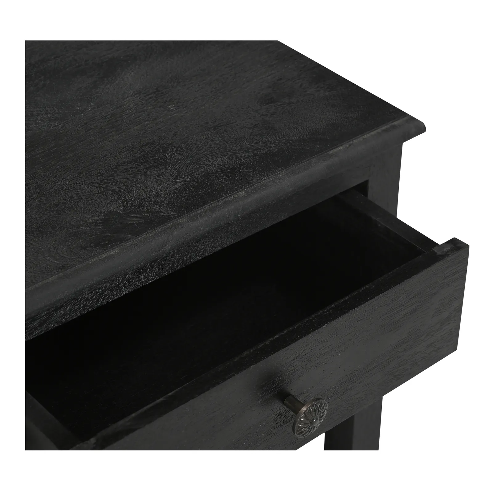 The Corrine nightstand adds a natural charm to any bedside arrangement by featuring a flower-detail drawer pull, subtly incorporating a rustic element into the minimalist design. Meticulously crafted from durable mango wood and completed with an antique-style finish, this nightstand offers lasting, practical storage with graceful, vintage appeal.