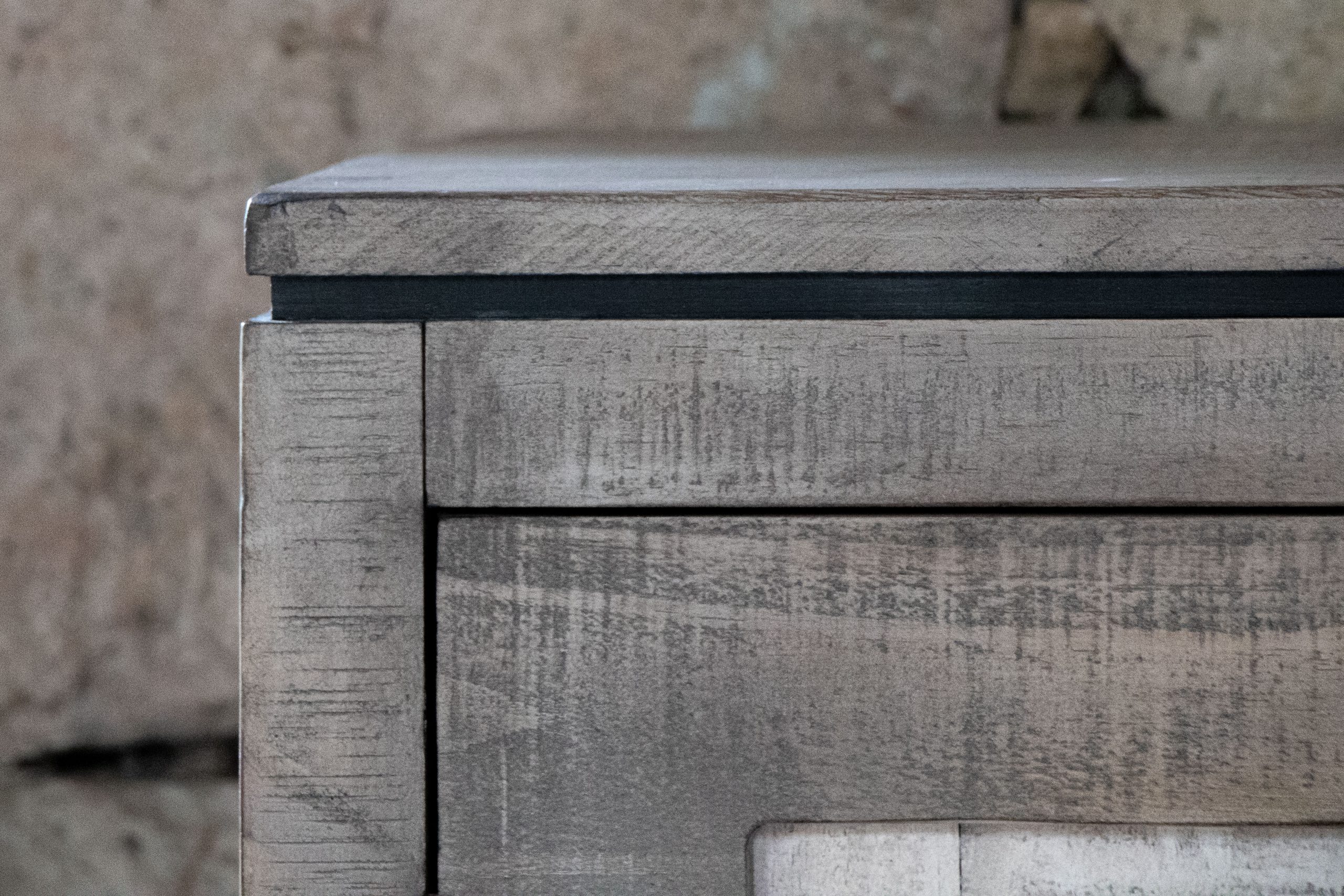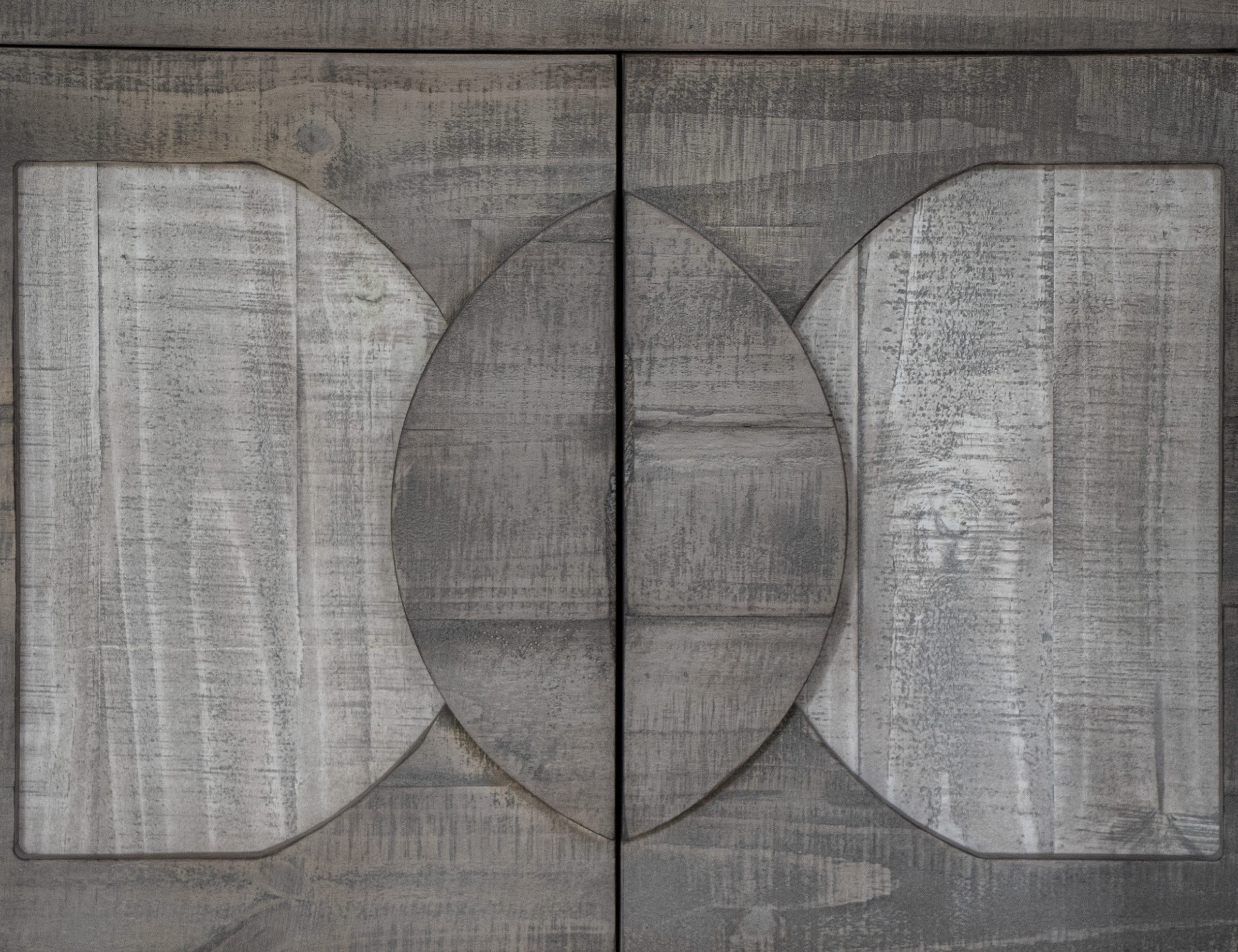 • Two-tone, multi-step lacquer finish on wire-brushed wood, showcasing weathered black on the case and a light beige tone on the door panels, adding a striking and elegant touch.