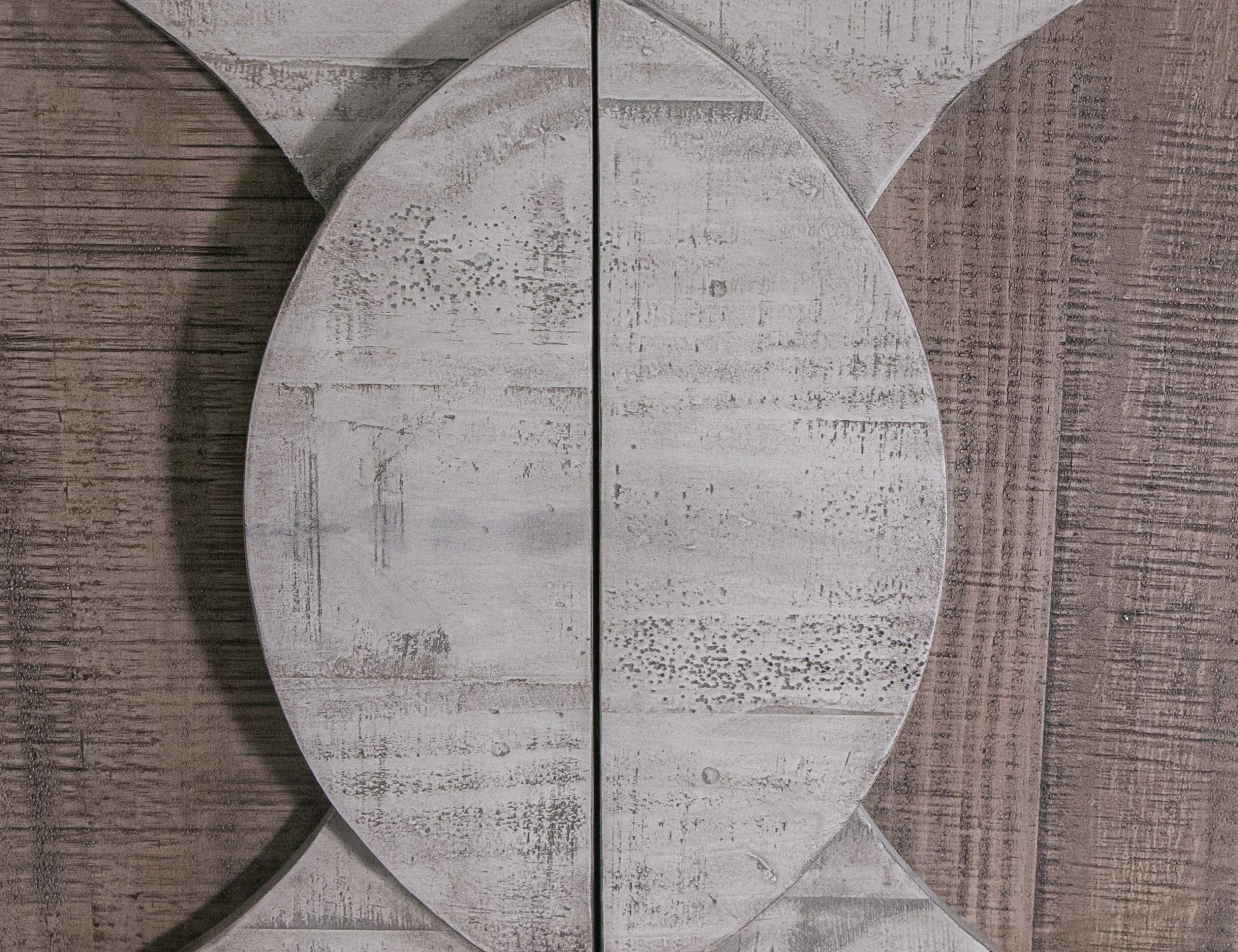 • Two-tone, multi-step lacquer finish on wire-brushed wood, showcasing weathered chocolate brown on the case and a light beige tone on the door panels, adding a striking and elegant touch.
