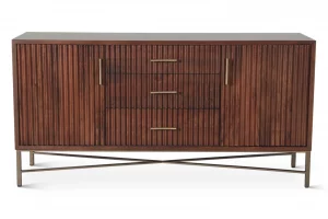 The Cosmopolitan 68″ Sideboard in Honey Brown combines timeless design with functionality. Featuring an antique brass gold metal base and drawer hardware, fluted front details, and a warm honey brown finish, it offers both style and stability for any dining or living space.