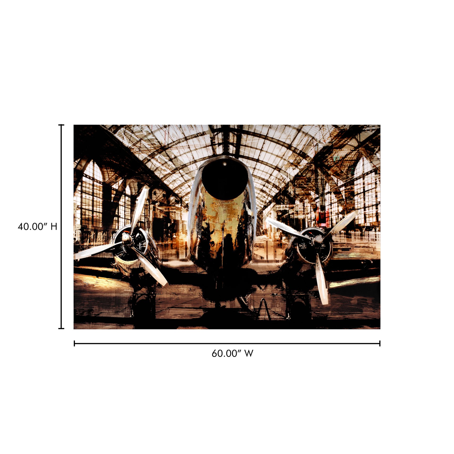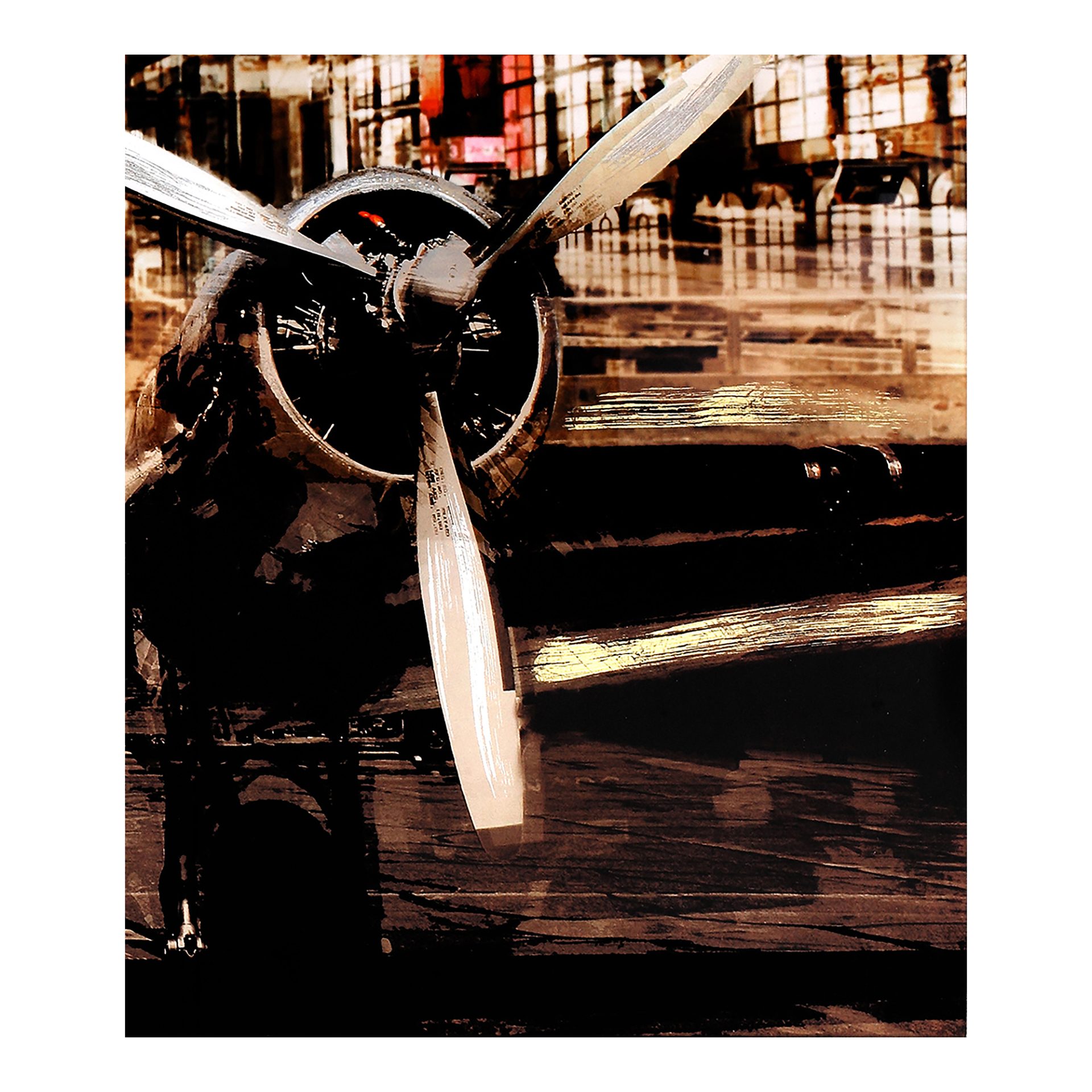 An image of a classic prop plane, sits under a retro glass hangar, awaiting its next mission—vintage-inspired beauty, ready to hang.