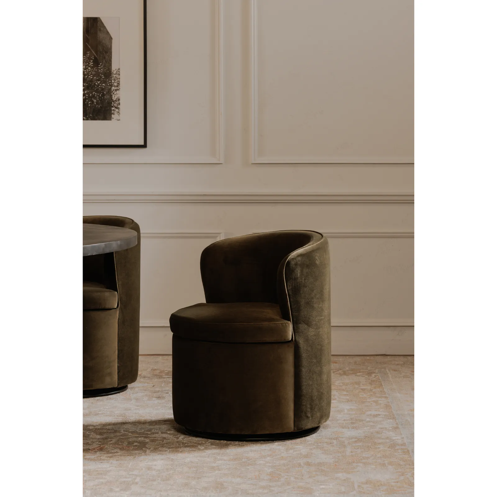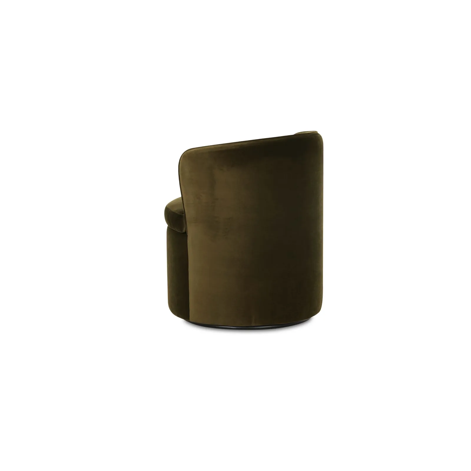 The Dane swivel dining chair adds sumptuous comfort with faux green mohair upholstery enveloping its gentle curves. A 360-degree swivel base facilitates effortless engagement, perfect for intimate conversations.