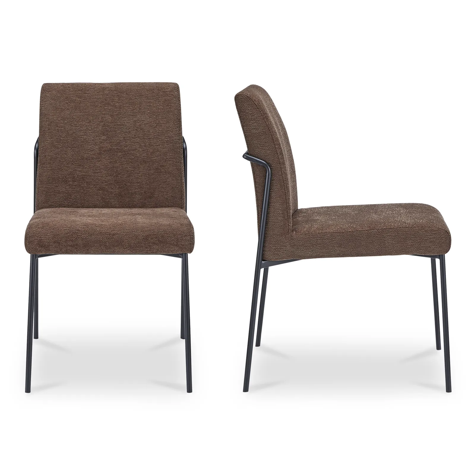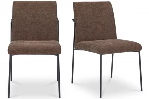 The Danny dining chair marries visual lightness with sumptuous comfort. A slim metal frame curves gracefully, supporting plush dark brown upholstery. The minimalist base imparts an ethereal quality, contrasting beautifully with the padded seat and back.