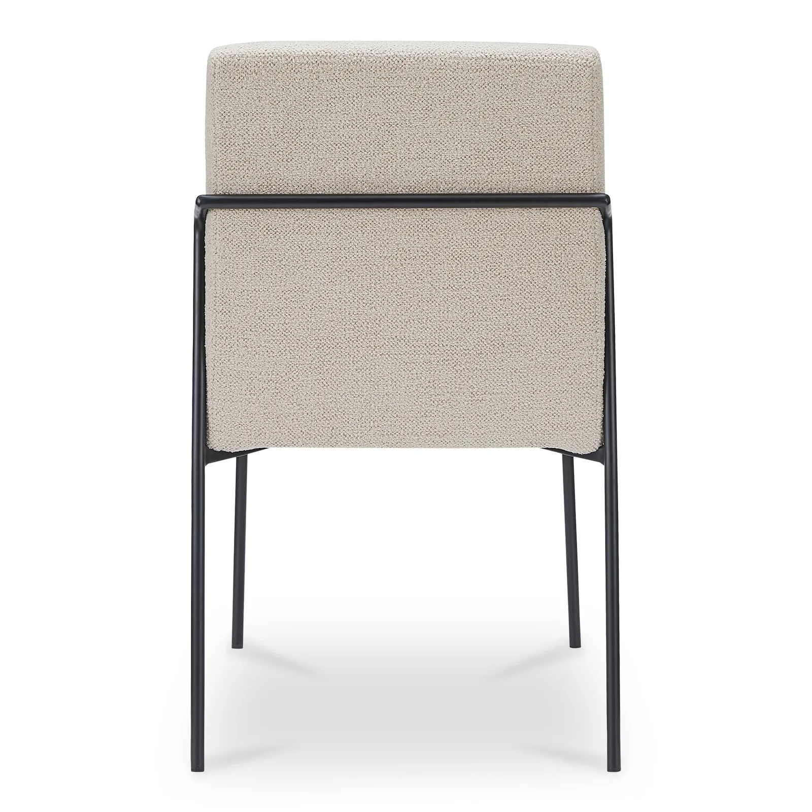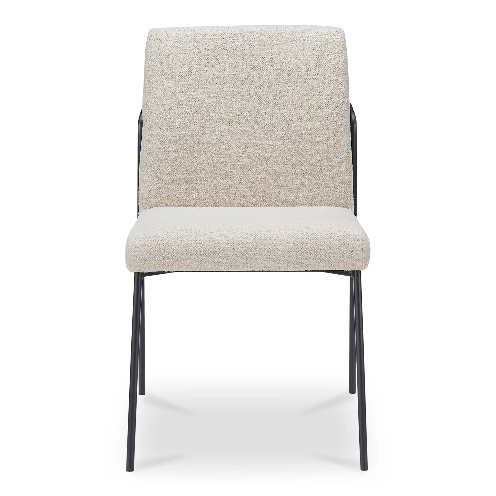 The Danny dining chair marries visual lightness with sumptuous comfort. A slim metal frame curves gracefully, supporting plush ivory upholstery. The minimalist base imparts an ethereal quality, contrasting beautifully with the padded seat and back.
